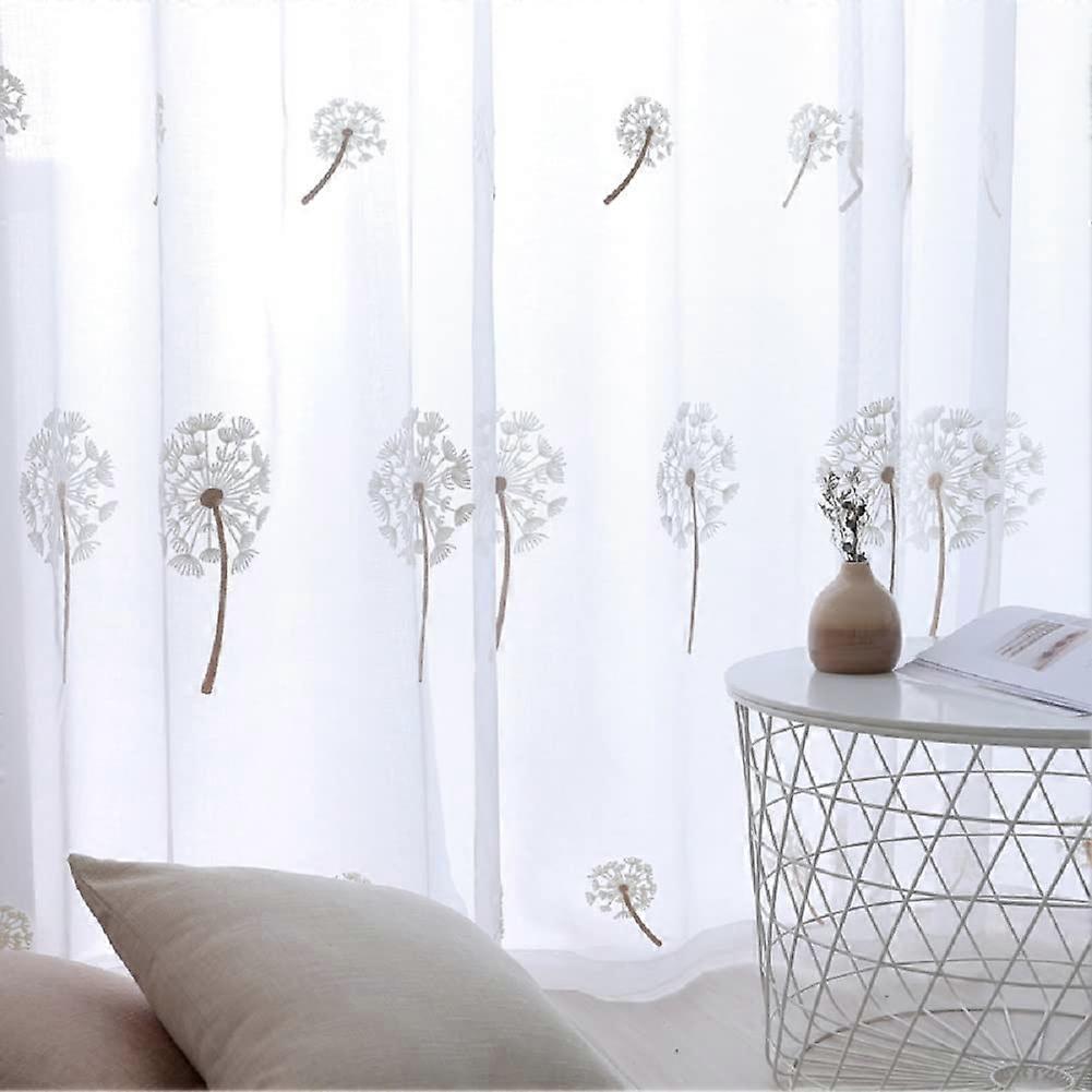White Dandelion Embroidery Sheer Curtains 100 Width Voile Window Treatments for Bedroom and Living Room
