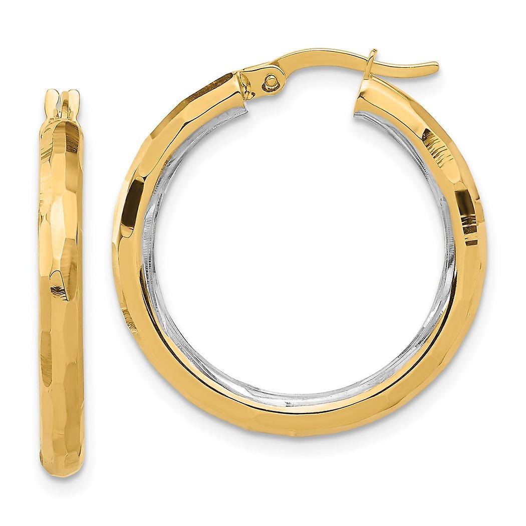 26mm 14k With White Rhodium Polished and Diamond-cut Hoop Earrings - Measures 27.75x26mm Wide 3mm Thick - 2.7 Grams In 14k Yellow Gold - - Thickness: 3 mm - Width of Item: 26 mm - Length of Item: 27.75 mm - Earring Closure: Wire & Clutch - Earring Type: Hoop - Finish: Polished -