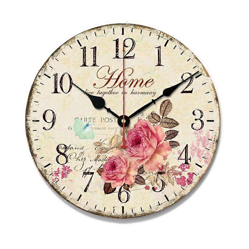Home Wall Clock 30CM Wooden Battery Operated Indoor Decorative Wall Clocks Vintage Clock (Pink Roses)