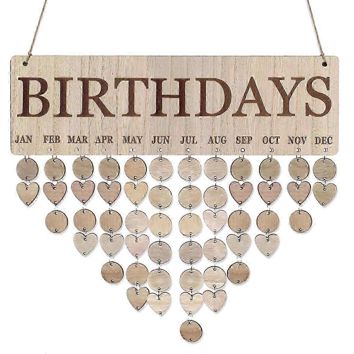 Description This wooden calendar comes with 1pcs board, 1pcs hanging rope, 25pcs round wood discs, 25pcs loving heart wood discs and 50pcs iron loops rings. All you have to do is write on the wooden disc the name and date and then it under the appropriate month of the calender. Great reminder for friends' birthday, Mother's Day, Father's Day, etc, and it'll be also a nice indoor decoration for your room. Features - Color: As Shown.- Material: Wood.- Size: Approx. 40 x 12 x 0.5cm.- Great for home wall decoration.- Best reminder for you to never miss a family member's or a friend's birthday, anniversary or festival like Mothers' Day, Fathers' Day.- Easy to assemble without any extra tools required. Easy system makes it simple to rearrange discs on board.- Great Gift for a Birthday, Wedding, Anniversary, Valentine's Day, Mother's Day etc.Packing list: 1 x wooden calendar