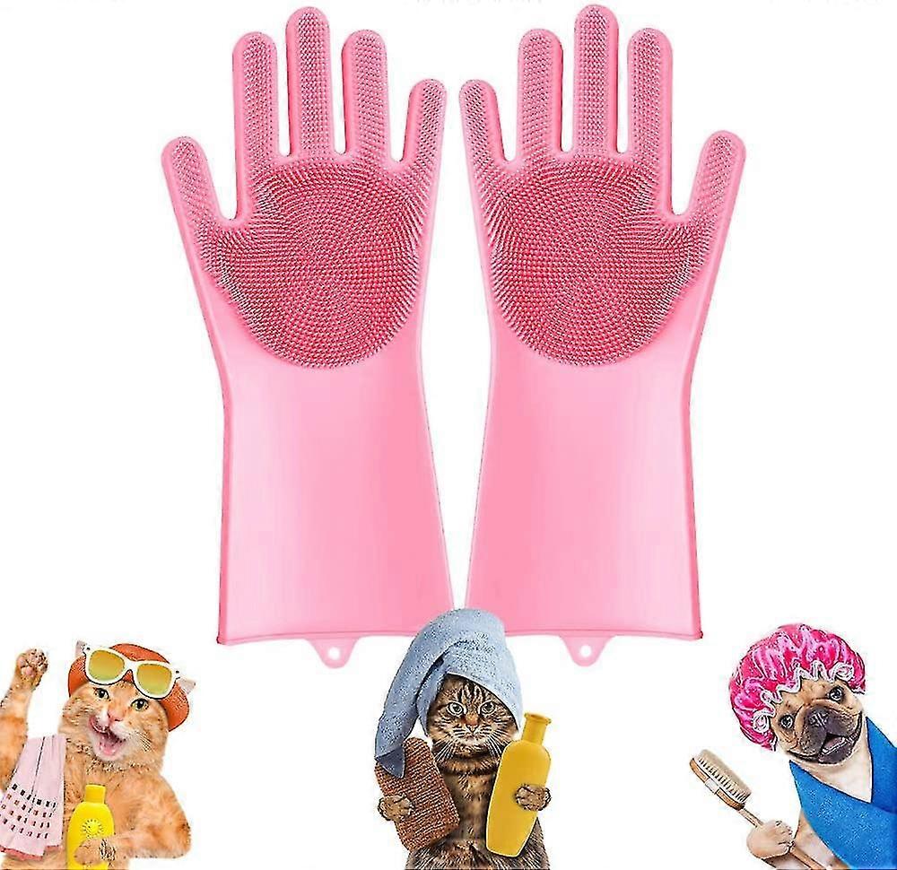 Premium Material - Dimension 13.8in * 5.9in. The magic gloves are made entirely of eco-friendly silicone, which is with superior elastic and soft property, no easy to tear. High Density Brush Heads - There are over 3,000 15mm brush heads spread over the glove palm to ensure easier hair grooming for your dogs oCATs without any uncomfortable feeling. Heat Resistant - Excellent heat resistance up to 501F, so the grooming gloves can be sterilized with boiling water while having a pet bathing. Never worry about getting scalded. Multiple Use - This Magic Gloves also can be used for kitchen, washing dishes, fruit & vegetable cleaning, cleaning the bathroom and bed room, removing wardrobe dust, and washing the car. Easy To Care - The loose hair of your pets will be fastened by the high dense brush heads, easy to clean. And the hanging hole makes the gloves easy to store. Get Pet Grooming Works Easier New magic pet grooming gloves are designed to ease your pet grooming works, there are over 3,000 high dense brush heads spread over the gloves tCATch any loose pet hair easily. Perfect for long or short hair pets like dogsCATs, rabbits, and more. We also considered your little pet's comfort at the same time. So we adopt the high-quality silicone material which is with superior soft and elastic performance to improve comfort level, your pet will enjoy the bathing time fully. Gloves Features: - Fast foaming, deep skin cleaning, easy decontamination. - Built-in non-slip particles to increase friction, not easy to creep down. - Superior heat resistant (up to 510 F), not worrying about getting scalded. - Easy to care and clean, the hanging hole makes the gloves easy to store. - Lengthen to 35cm design to prevent water from entering while having the bathing. - Ergonomic design to provide you with max comfort. Multiple Purpose It can also be used for pet hair massage. For kitchen bathroom cleaning, car wash is suitable. Cleaning the fruit, cleaning the bed, dusting the wardrobe is also good Brush bowl brush pot no longer needs iron wire ball, magic gloves one button to get, will not damage the iron pot. SpeciCATion Material: Silicone Size: 13.8in*5.9in Package Included: 1 Pairs of Pet Grooming Gloves