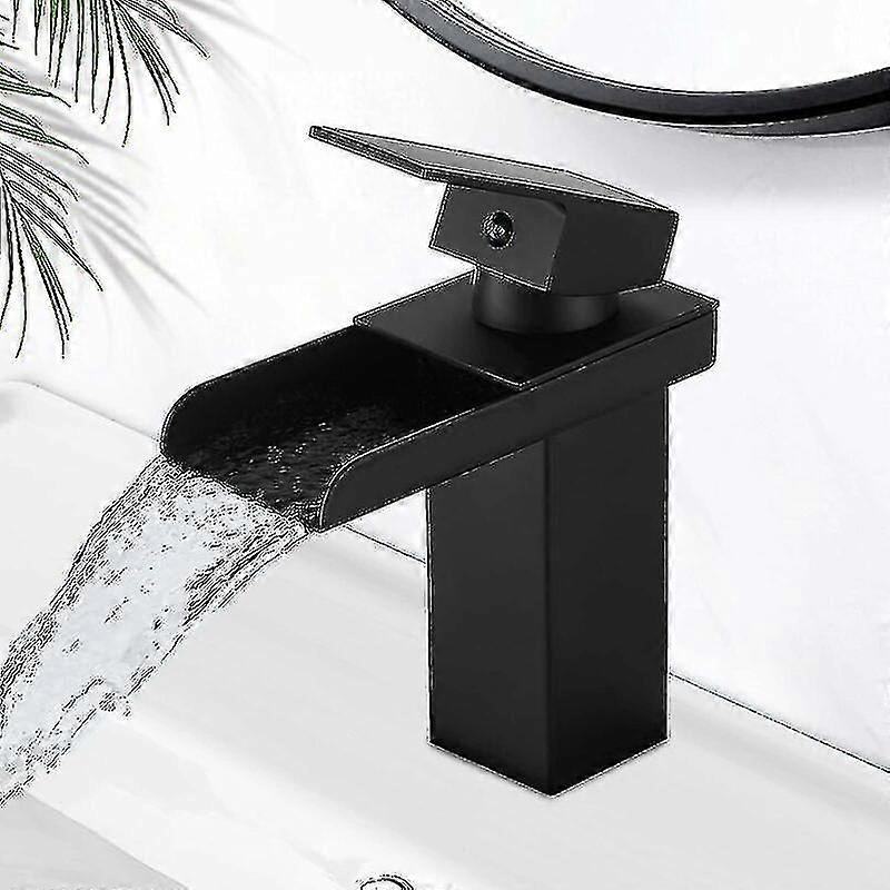 Matte Black Waterfall Bathroom Faucet, Single Handle Brass Basin Faucet With Cold Hot Water Available, Ceramic Valve, Concave Waterfall Design Bathr