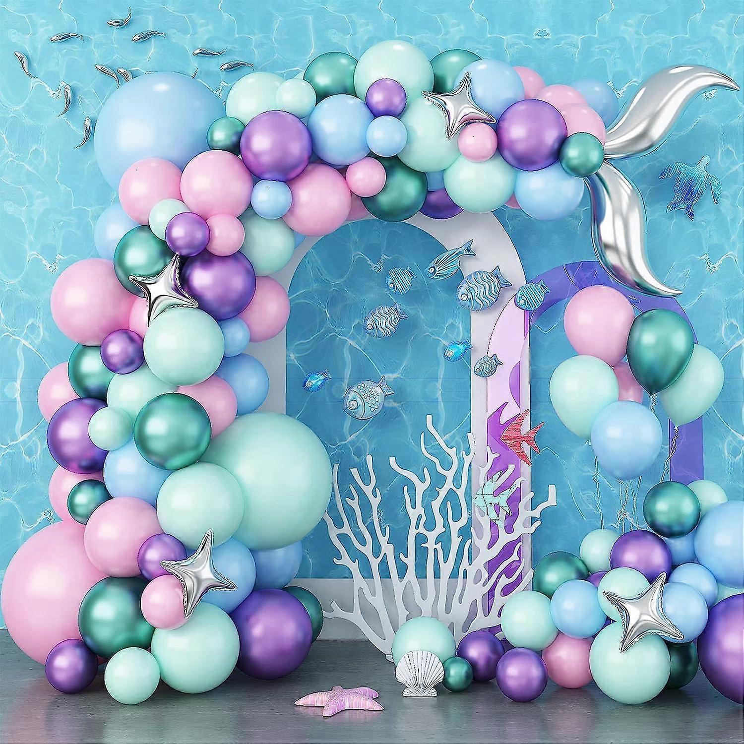 Mermaid Balloon Garland Kit, 134PCS Mermaid Balloons with Silver Mermaid Tails Stars, Macaron Purple Pink Green Metallic Green Purple Balloons Arch, f