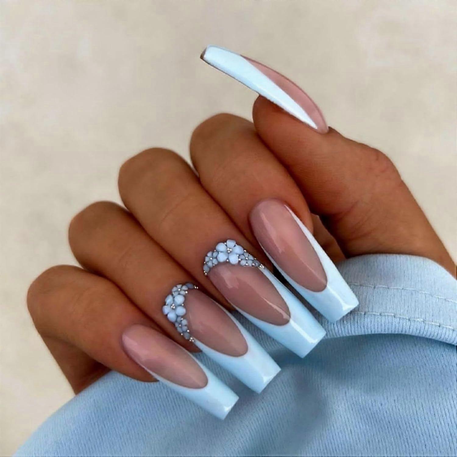 Medium Square Press on Nails Blue French Tip Glue on Nails Flower Acrylic Fake