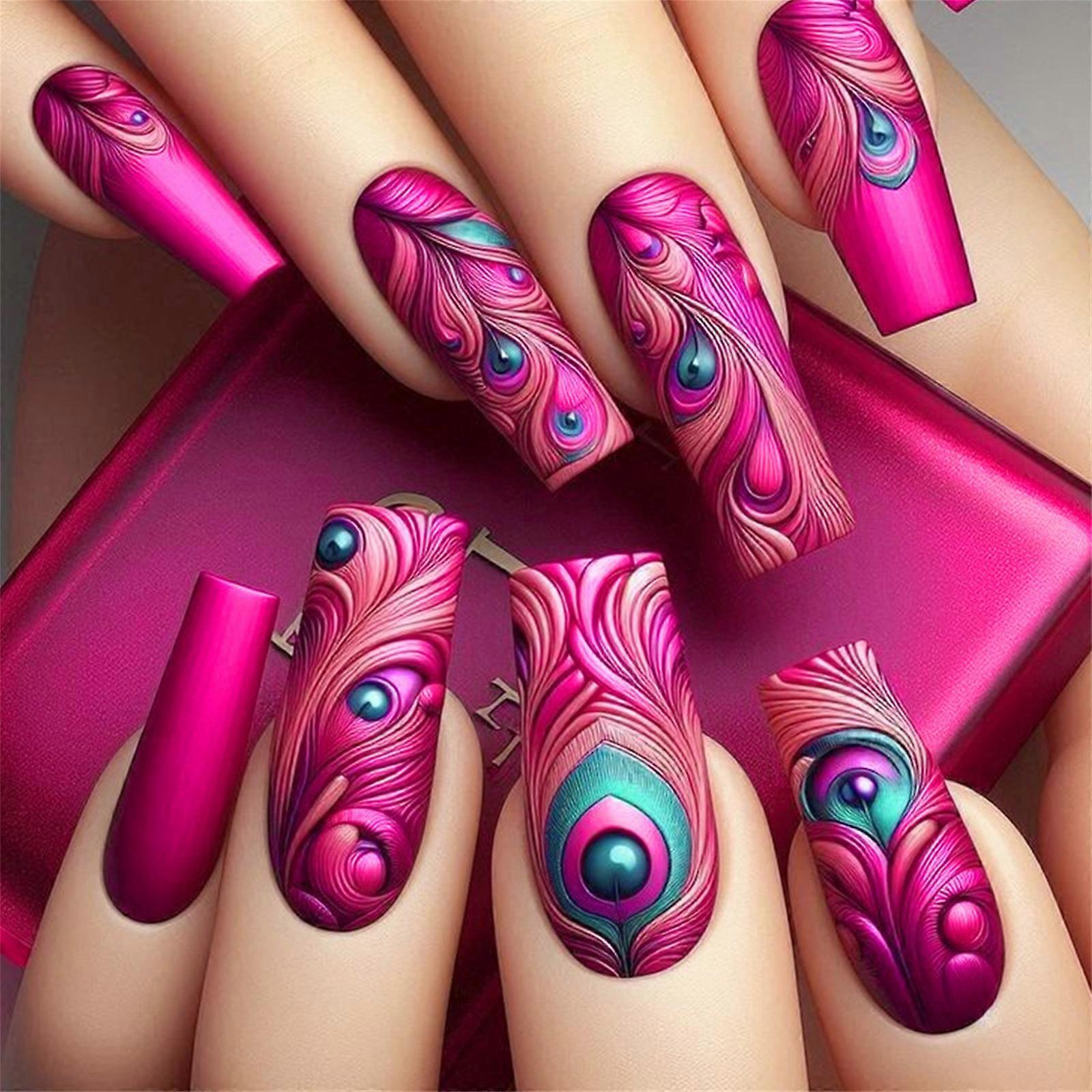 Medium Length Square Press On Nail Hot Pink Feathered Design Full Cover Long Coffin False Nail 24 Pcs for Women Nail Art