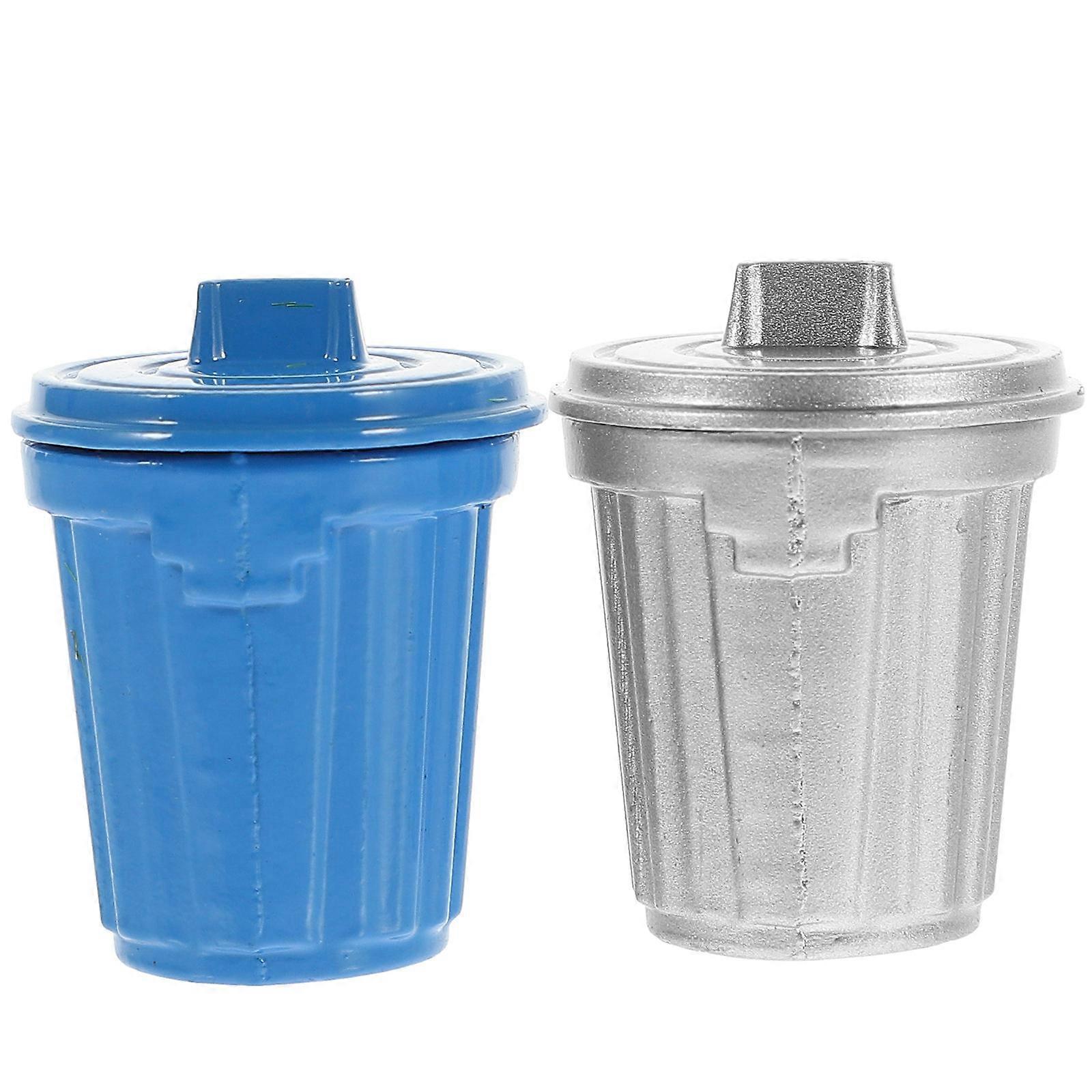 Mini House Trash Can Ornament Realistic Litter Bin Model for Doll House Supplies, Blue Silver, 2pcs, for DIY Table Decoration
