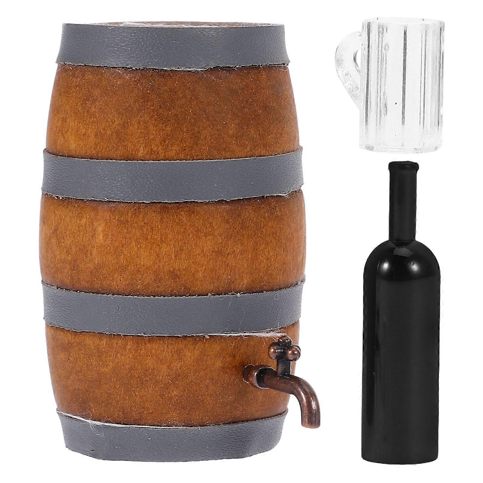 1 Set Mini Beer Barrel Model With Wine Cup And Bottle Dollhouse Accessory Miniature Model