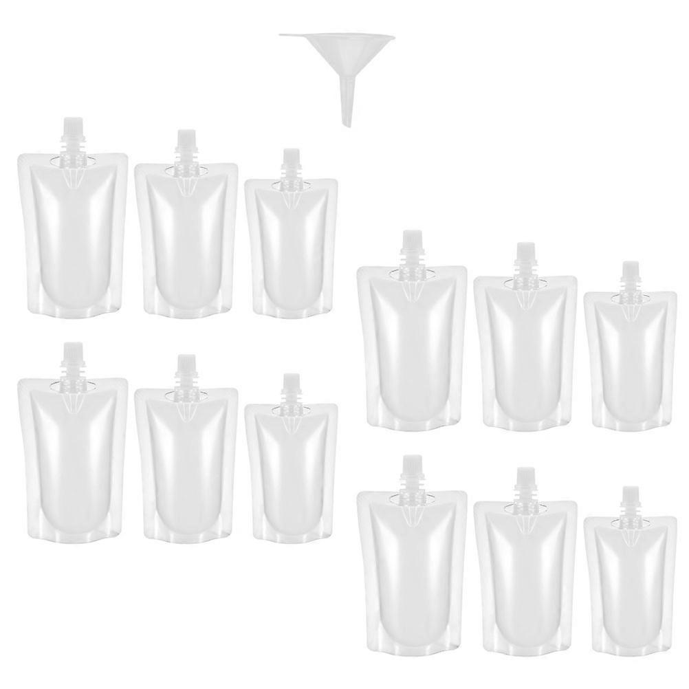 Are you struggling with how to store the drinks you're saving for a picnic? You don't have enough cups . Then I think this is where you really . The drink bag can easily fit into a backpack or even pocket and can be reduced in size with fewer contents, making it more portable. Features -Color:Transparent -Material:Plastic -Size(500ml):19.00X13.00X3.50cm/7.47X5.11X1.38in -Size(380ml):18.00X12.00X3.00cm/7.07X4.72X1.18in -Size(300ml):17.00X11.00X3.00cm/6.68X4.32X1.18in -Capacity:300ml, 380ml, 500ml -Wide application: Used to hold water, beverages, juices, beer, wine, or other beverages. -Airtight lid design: The lid design is able to help seal the bag tightly without leaking. -Easy to use: The spout design helps you pour out various beverages easily and practically, bringing of conveniences. -Multiple occasions: Suitable for outdoor hiking, camping, fishing, picnic, travel, or other activities. -Value set: Offer a sufficient number of beverage flask containers that can meet your daily use and replacement needs. Package list: 12 x 1 x Funnel