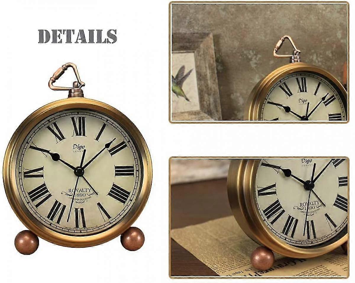 Metal Golden Desk Clock, Retro Vintage Non-ticking Table Small Alarm Clock Battery Operated Silent Quartz Movement Hd Glass For (roman)