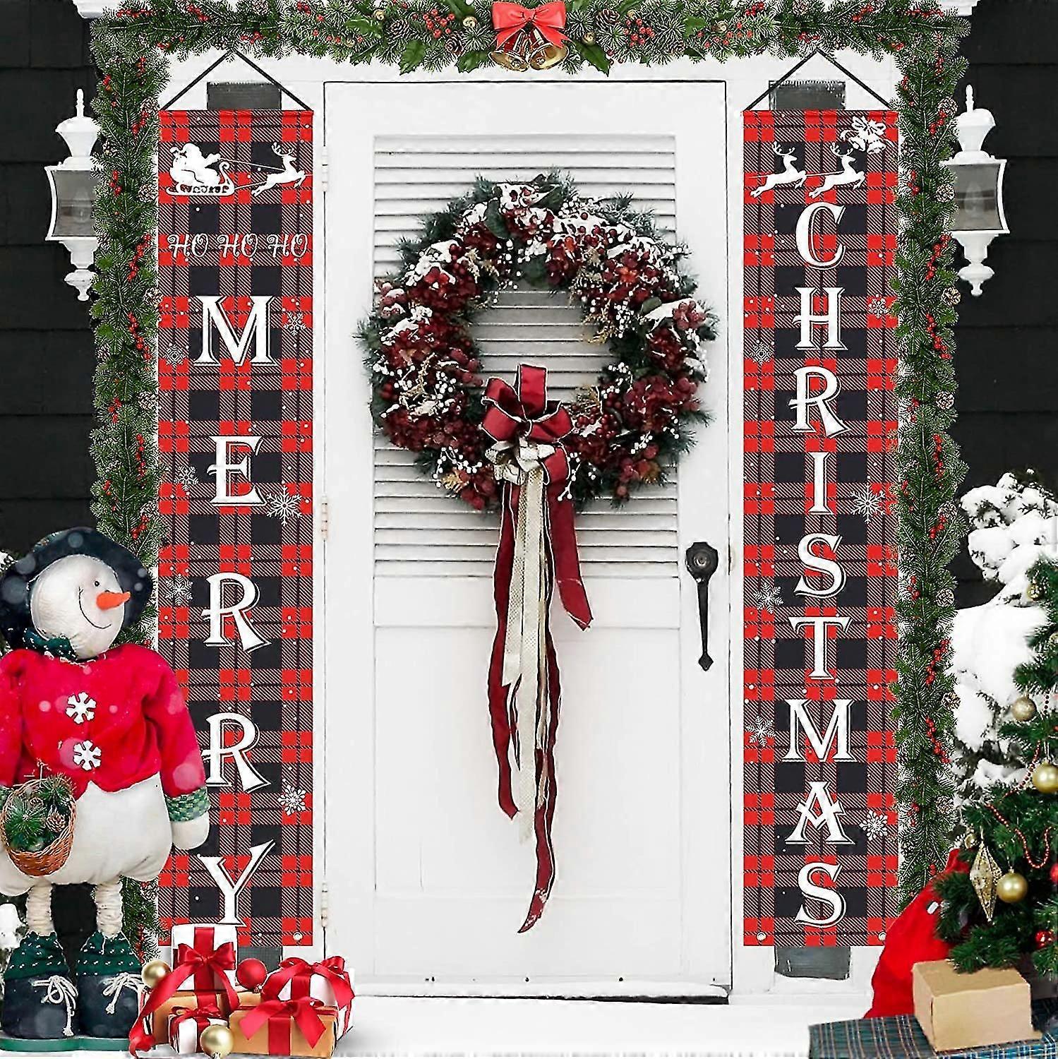 Merry Christmas Decorations Banner, Christmas Porch Sign Red Plaid Hanging Banners For Indoor Outdoor Front Door Wall Xmas Christmas Decoration