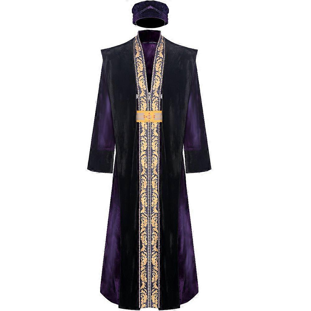 Mens Gothic Wizard Robe Purple Black Velvet Cloak with Gold Trim and Hat Warlock Sorcerer Costume for Halloween or Stage