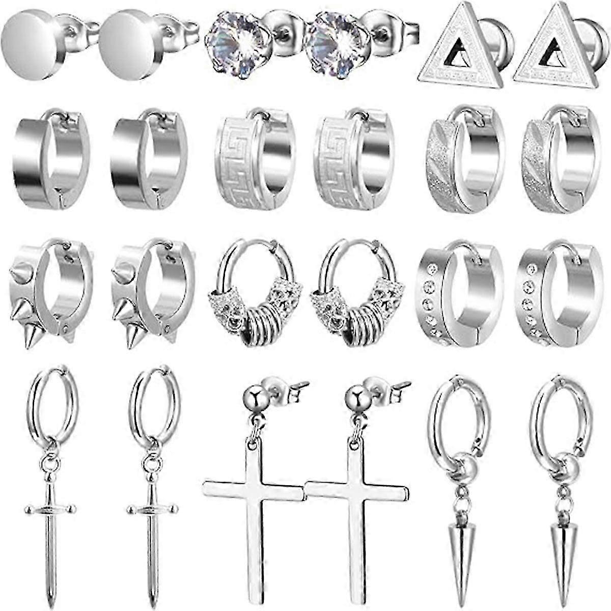 Men's Silver Stainless Steel 12-Pair Earrings Set: Plugs, Screw Studs, Punk Dangle Styles, Kpop Fashion & Black - Compatible Earrings