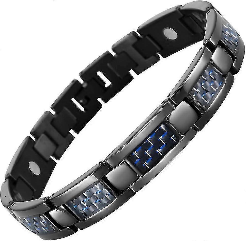 Product DescriptionTitanium Magnetic BraceletBlue Carbon Fiber and Pure Titanium Extremely Light Weight PerformanceBlue Carbon Fiber This stylish material is also used in racing cars and aerospace design making this jewellery very modern and contemporary, you're sure to get lots of great compliments! It's so discreet no one will know it's a Magnetic therapy bracelet!Titanium is one of the strongest natural metals on earth. It's super strong and lightweight making it the perfect metal for jewelryTitanium is extremely robust, it's 3 x the strength of stainless steel making it the perfect for everyday wear and tear. Titanium jewelry is extremely lightweight so you'll hardly know you're wearing it.nbsp; nbsp; Our Pure titanium bracelets are hypoallergenic, meaning they won't irritate your skin or cause allergic reactions like other metals can.The bracelet size is 8.5 inches long and 0.47 inches widenbsp;nbsp;Subtle Magnetic TherapyHigh Strength 3000 gauss Rare Earth Neodymium Magnets. These are some of most effective in the magnetic health therapy market, much stronger than magnets from other sellers. Magnetic therapy is believed to help with the following:nbsp;nbsp;Alleviation of arthritic pain Reducing Inflammation Improving Blood Circulation Reduce stress, anxiety, fatigue, insomnia