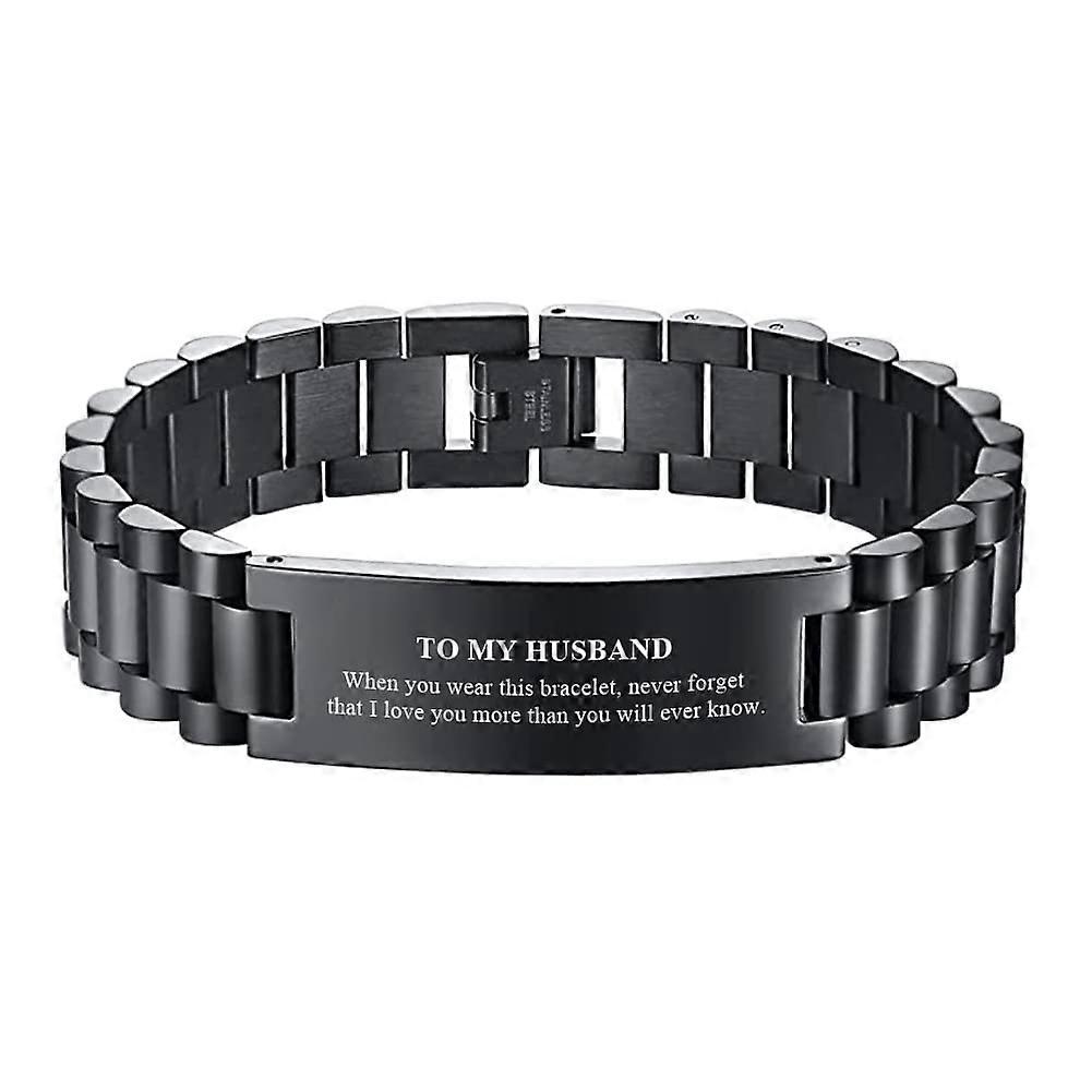 1. Husband Gifts from Wife BraceletThe high quality stainless steel bracelet is beautifully laser engraved with the sentimental saying 'TO MY HUSBAND: when you wear this bracelet, never forget that I love you more than you will ever know'. 2. What You Can Get1 personalized bracelet for husband (9inches length adjustable), 1 link removal tool, 1 nice quality gift box. Each bracelet is individually crafted and carefully packaged in a nice gift box. 3. Top Husband Gifts for OccasionsGifts for husband who has everything, valentines day gifts for him, birthday gifts, fathers day gifts, anniversary gifts, Christmas gifts, stocking stuffers for husband. 4. Hypoallergenic MaterialMade of high quality stainless steel, hypoallergenic, durable, fashionable and sturdy. Neither rust nor fade.
