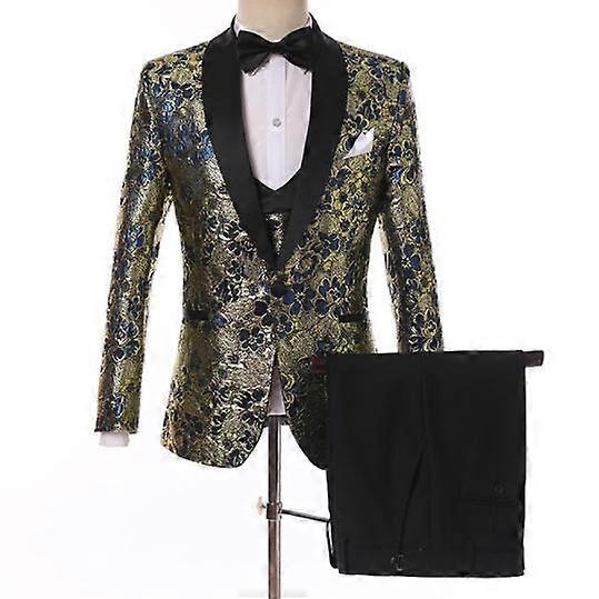 Men's Print Slim Suit Set Groom Dress Tuxedo Embroidered Suit 3Pcs