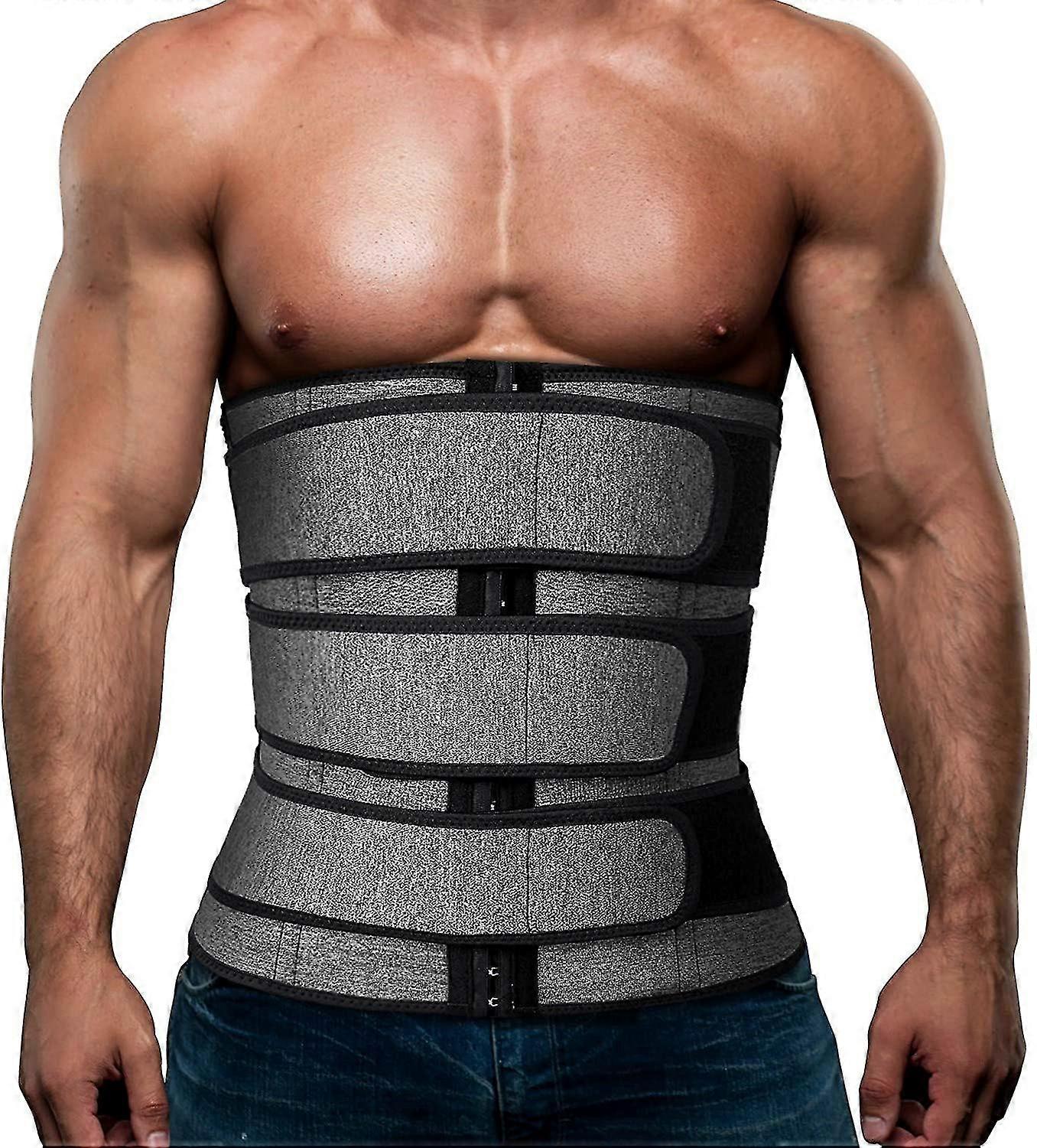Product DescriptionMens Workout Waist Trainer Neoprene Corset Sauna Sweat Trimmer Slimming Belly BeltsMens sauna waist trainer for weight loss has large coverage, which makes you sweat.Waist workout trainer stays in place, doesnt ride up or down.Belly waist trainer for men contains velcro straps to give you the ability to shape your waist.The waist trainer belts provide great back support and has the belly sweating.Waist cincher for men holds and eliminates the issue of having back fat spillage.Belly sweat band for weight loss for men promotes good posture and it has taken inches off your waist.three velcro staps 4 rows of hook and eye steel bones fabric3 High Adhesive Velcro BandsHaving 3 separate belts gives you the option on how tight you want each belt, because most waist trainers only have the extra cinching strap on the middle of the abdomen. You can make the lower belt tighter than the upper belts to concentrate more towards your lower back.4 Rows of Hook and Eye ClosuresThis is adjustable by having 4 rows of clips.