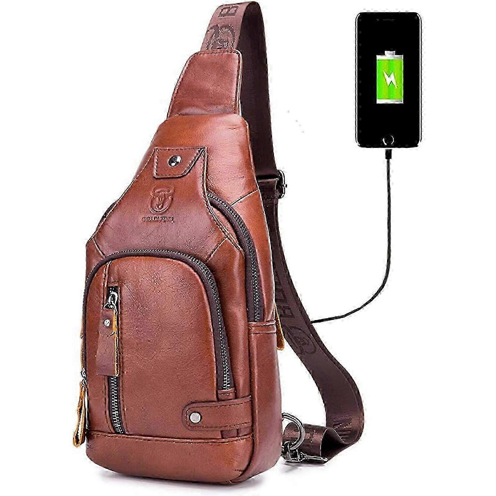 Men's Genuine Leather Chest Daypack with USB Charging and Anti-Theft Design