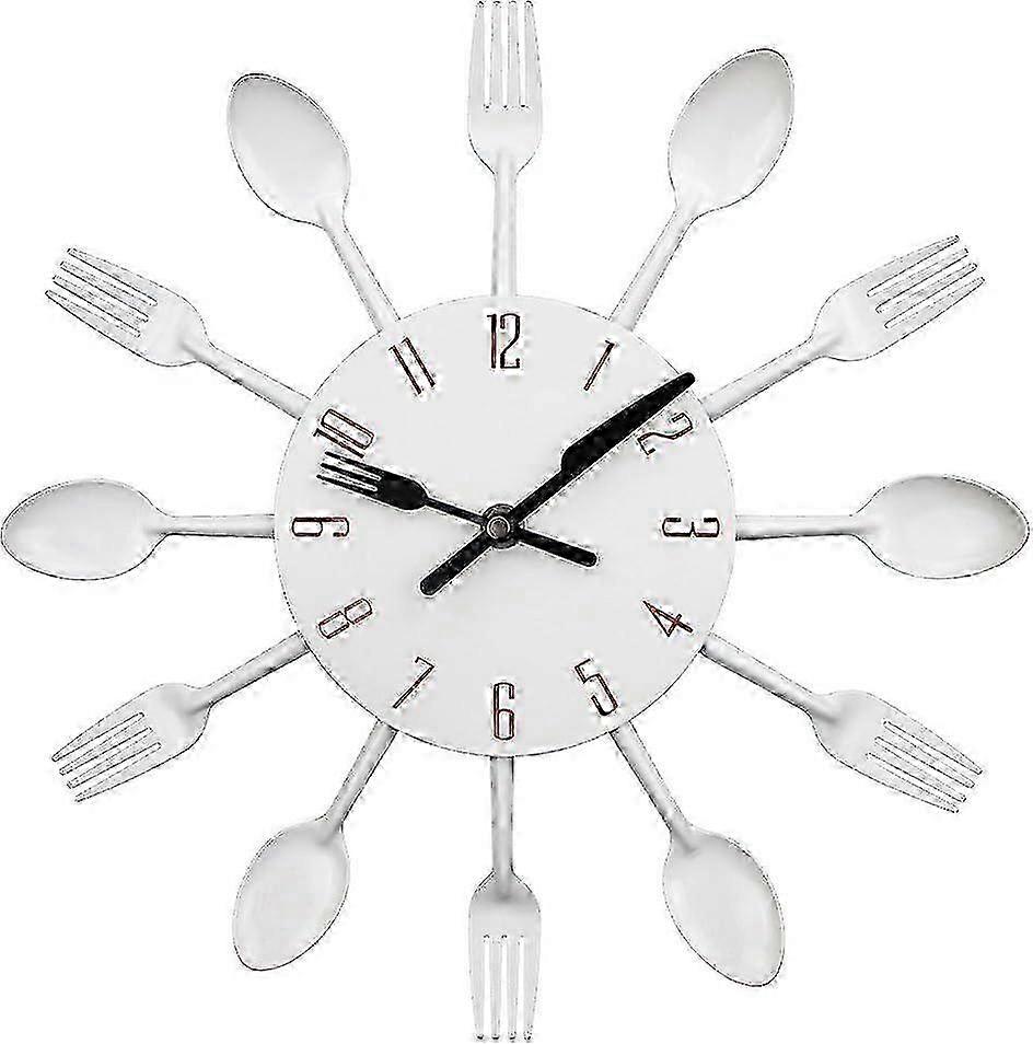 Modern 3D Removable Kitchen Wall Clock, Creative Cutlery Spoon and Fork Design, Mirror Wall Decal for Home Room Decoration (White)