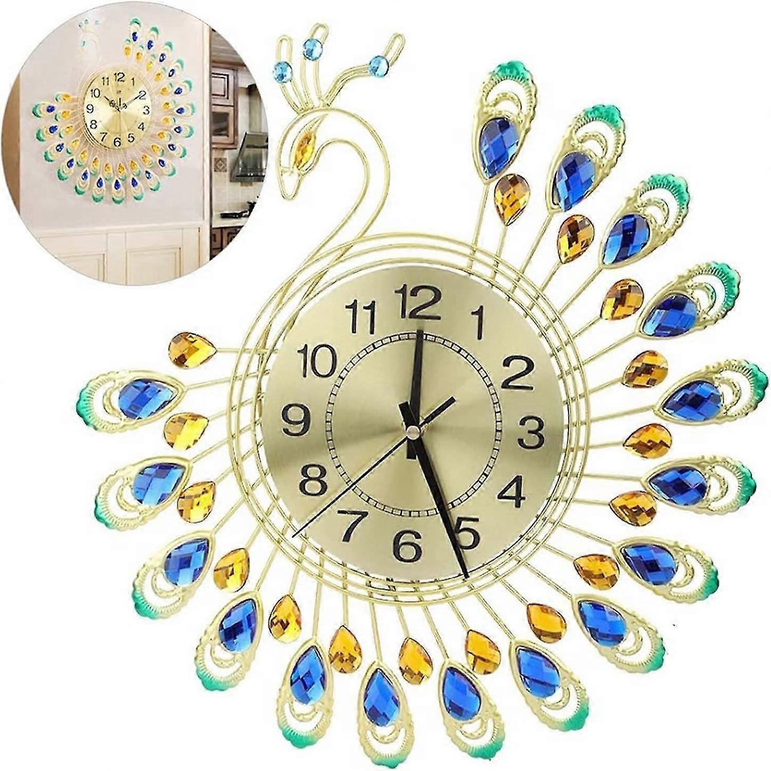 Modern 3D Peacock Shape Wall Clock, Large Iron Non Ticking Silent Clock for Living Room, Bedroom, Home Wall Art Decoration