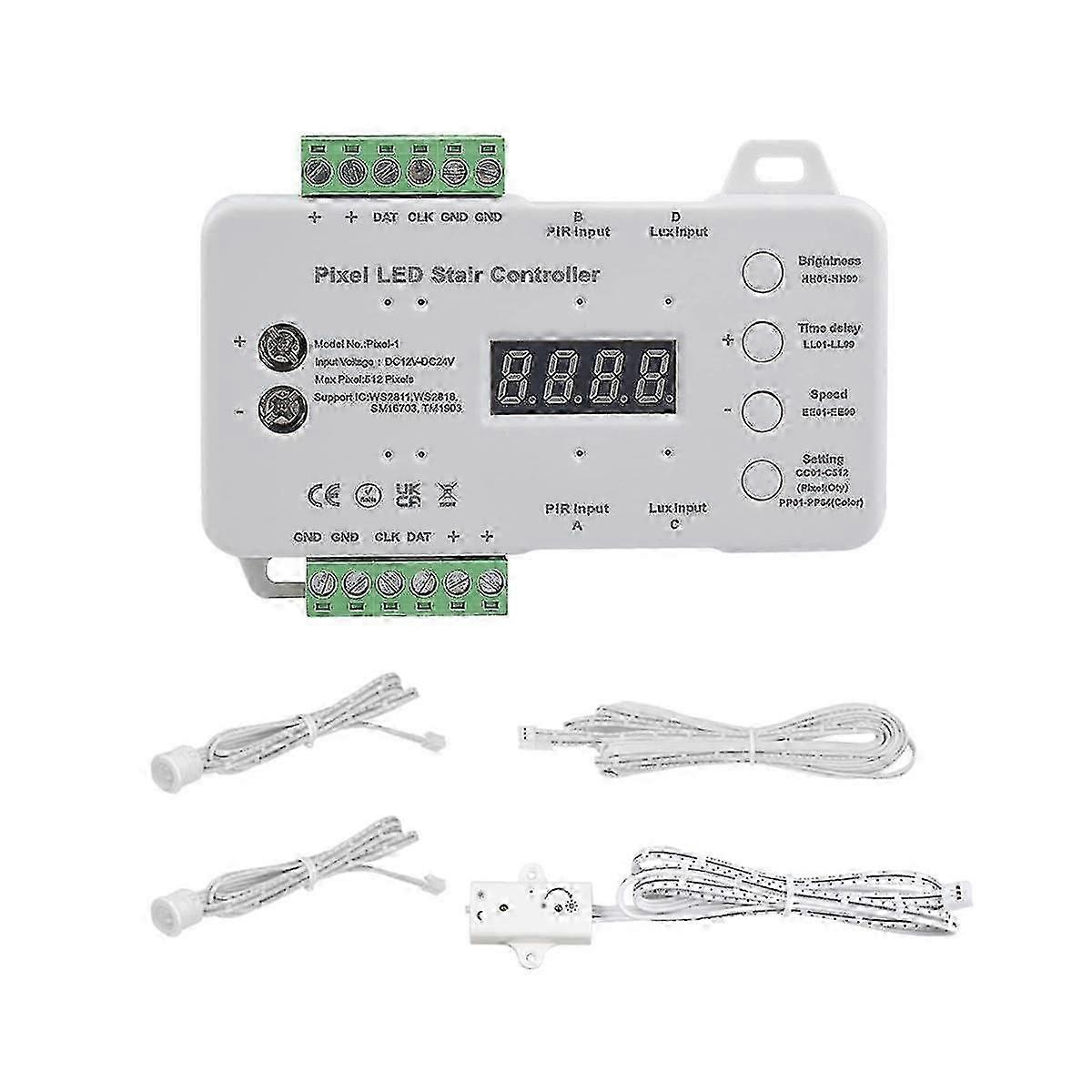 The motion sensor activated LED stair light controller automatically turns on to illuminate the stairs when you reach the top or bottom step, and turns off when people leave. With daylight sensor, the PIR sensor will not turn on the light when the ambient light is sufficient.Long press the setting button to adjust speed, adjustable brightness, adjustable delay time, RGB and monochrome, pixel and color.Suitable for RGB light strips, LED Smart Stair Lighting Controller is suitable for monochrome light strips and RGB light strips. Select CH-1 if you are connecting a monochrome pixel to the controller. Choose CH-3 if you connect an RGB pixel to the controller. light controller has stable output and sensitive induction. Great for home stairs, malls, stores and more. Comes with mounting accessories for ease of use.Wide compatibility: stair lighting controller with anti-leakage system, DC12V-24V wide working voltage, stable output, supports almost LED driver ICs such as WS2811 WS2818 SM16703 TM1903.Colour:WhiteMaterial:plasticPackage Contents:1 x Pixel Stair Lighting Controller2 x 1M PIR Motion Sensor1 x 1 x 1M Daylight SensorOnly the above package content, other products are not included.Note: Light reflection and different displays may cause the color of the item in the picture a little different from the real thing. The measurement allowed error is +/- 1-3cm.