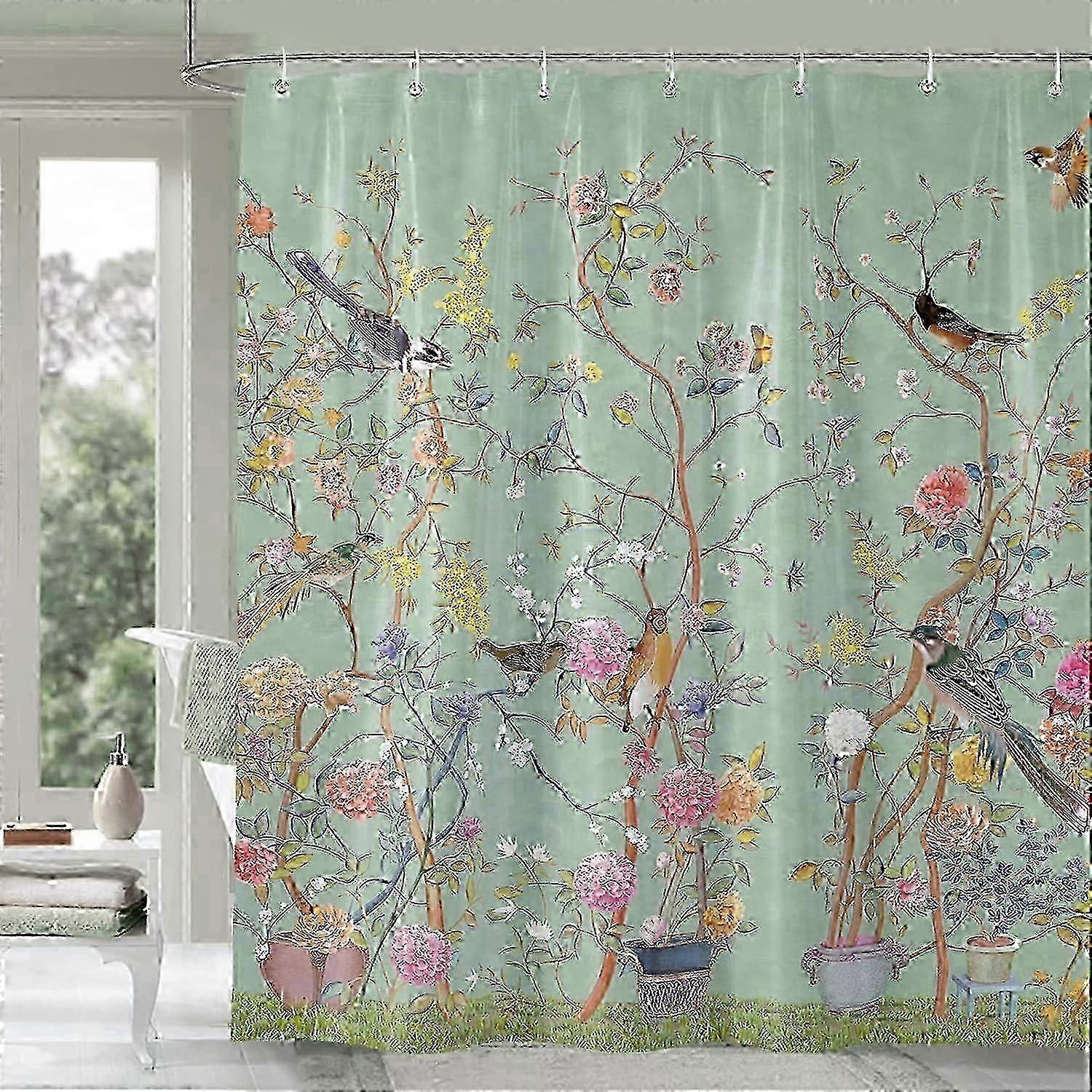 Mould Proof Waterproof Shower Curtain Green Bird Floral Quick-Drying Bathroom 180x180cm (71x71Inch) Weighted