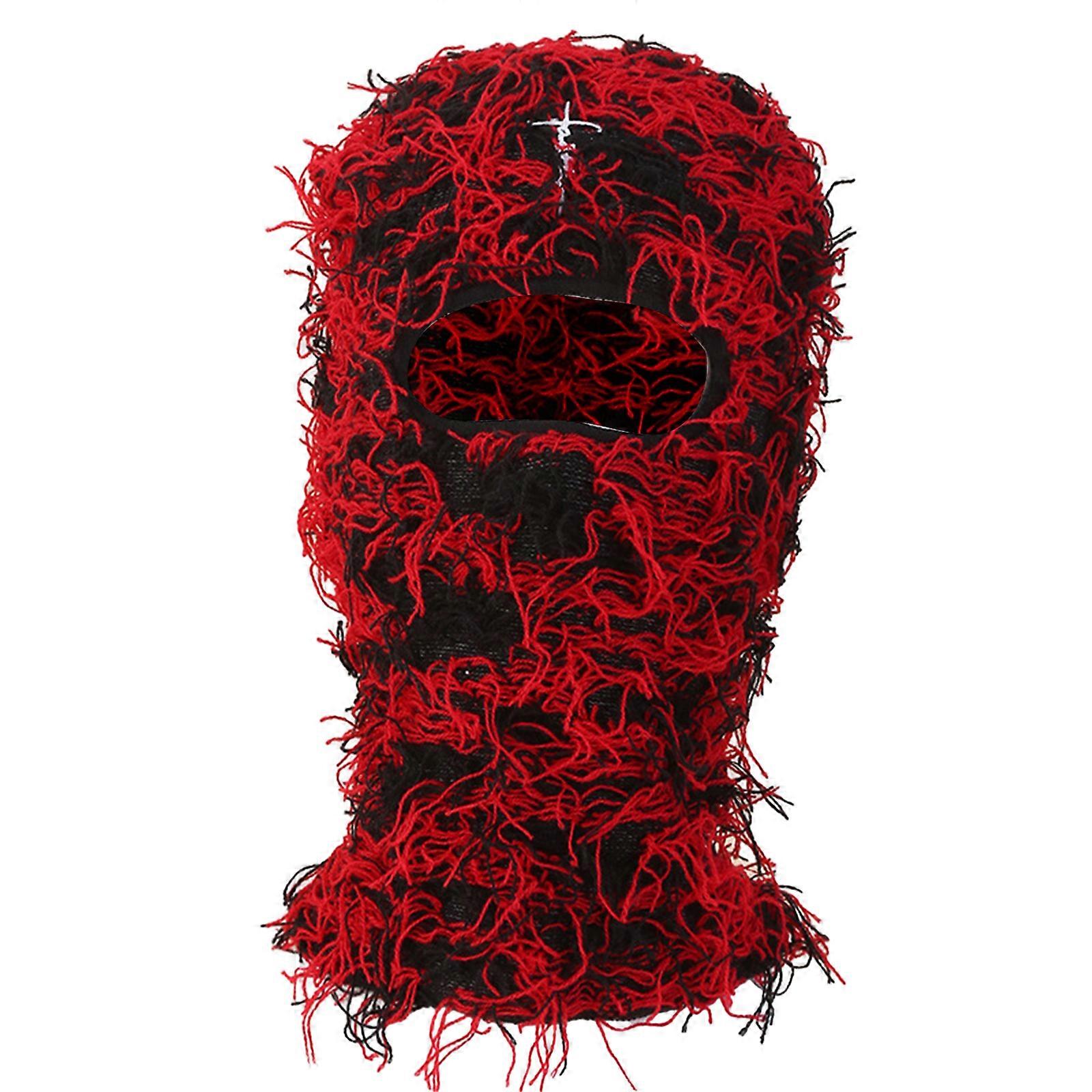 Unisex Skullies Hat with Distressed Fringes Photo Props Knitted Pullover Hat Balaclava Costume Props Skull Cap Red