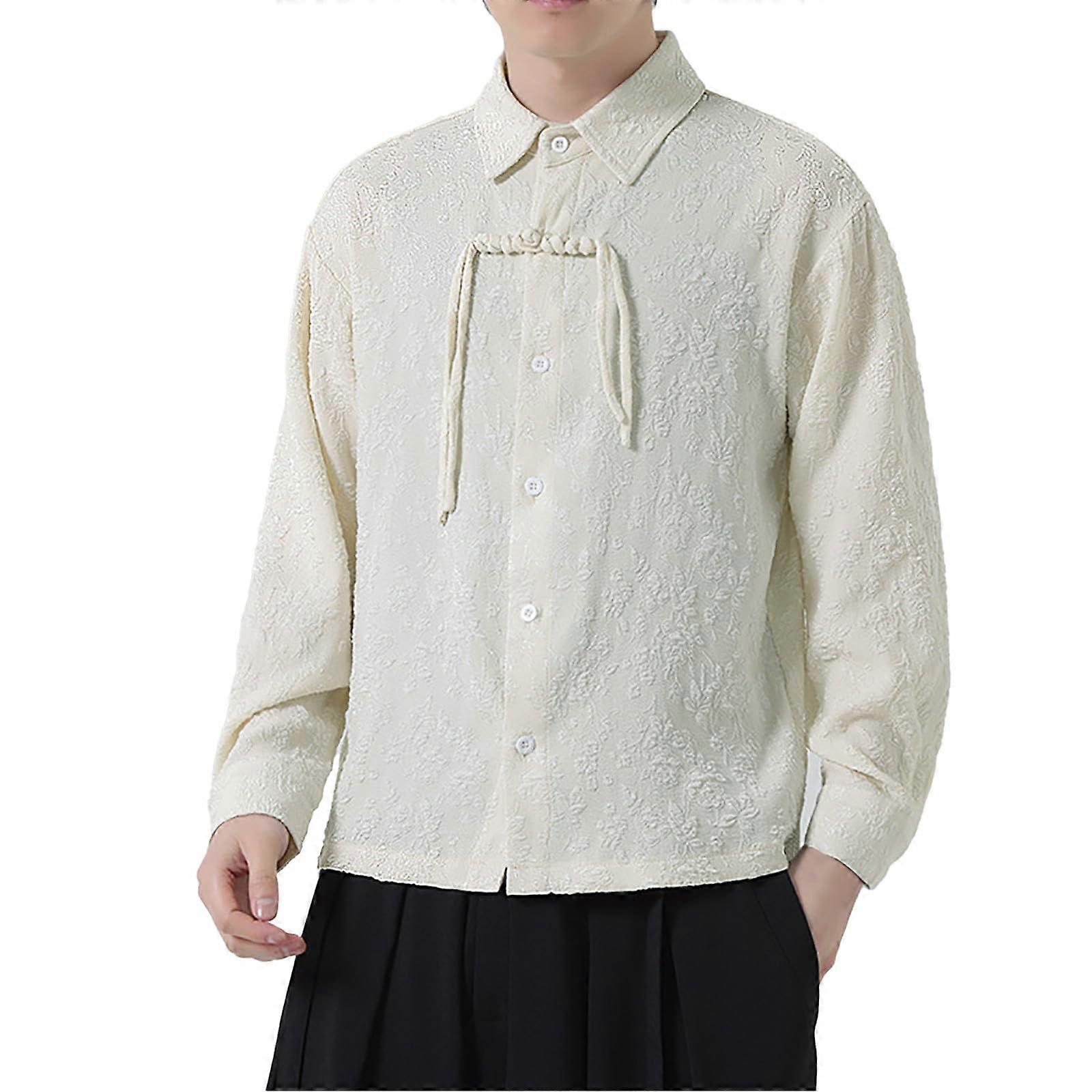 Unisex Traditional Chinese Tang Style Shirt Retro Collar Cotton Short Sleeve TShirt Men's Breathable Cotton Shirt Long Sleeve Jacket 3XL Beige