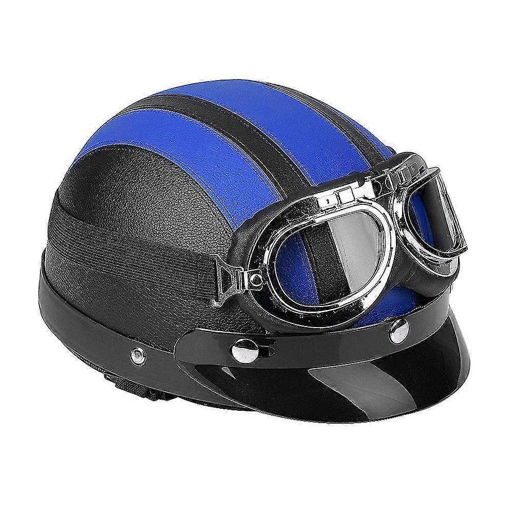 Universal Motorcycle Scooter Blue Synthetic Leather Open Face Half Helmet with Visor and UV Goggles