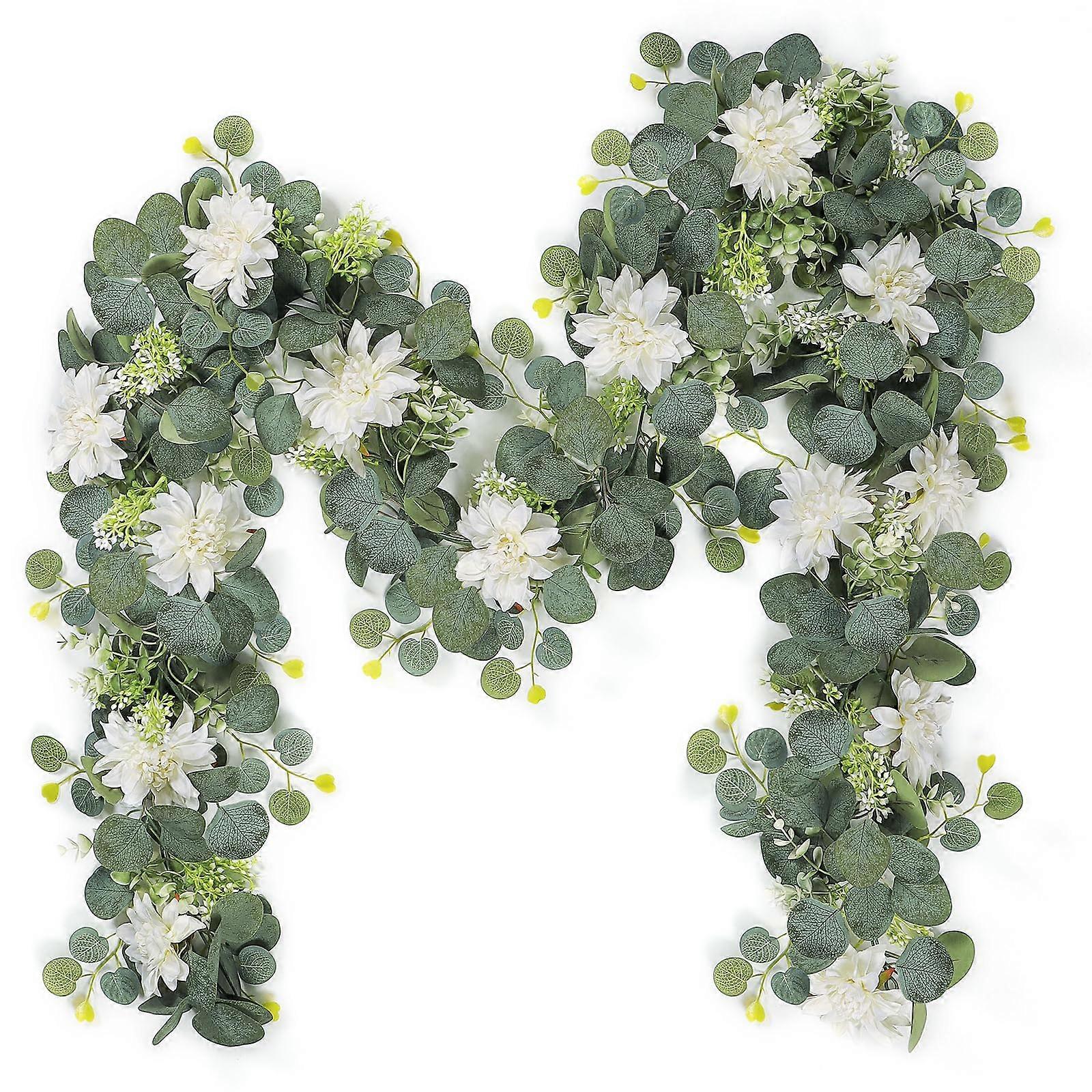 Eucalyptus wreath flowers with 2 packs 12ft Fake flower wreath White Dahlia Silk Flower