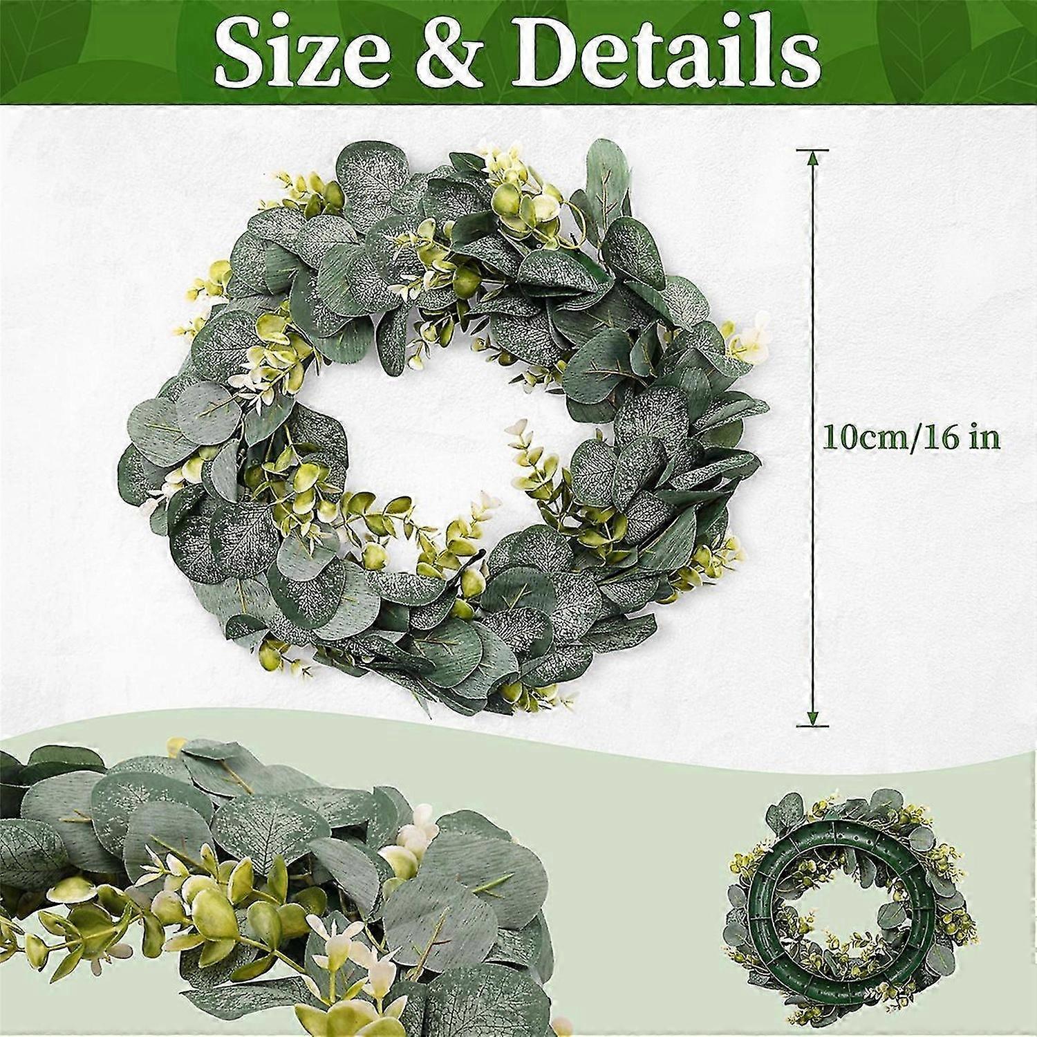 Bloom naturally: The spring wreath is embellished with flowers, just hang on the outer door and the wreath will stay in full bloom and never fade. door wreath: Green eucalyptus wreath has an overall diameter of about 40cm, suitable for spring and summer door decoration. [Exquisite Handcraft] Outdoor Garland: Fabric leaves and blooming green garland petals make the garland fuller and more vibrant, keeping it green all year round. Versatile Decor: DIY Garland as Farmhouse Welcome Garland, Christmas Door Garland, Wedding Garland, Wall Decor, Kitchen Decor, Window and Apartment Door Decor, Summer Garland. [Durability]The eucalyptus leaves are made of high-quality silk, which will never fade and never rot.<br><br>[Easy to Clean] Garland is easy to clean and can be used for a long time. You can clean with water and blow out with a hair dryer to keep the wreath neat. Four Seasons Garland: You can hang it above the fireplace mantel, put it on the living room wall, windows, weddings, birthdays, shops, all indoor and outdoor decorations. Colour:green Material:silk flower<br><br>Package Contents: 1 x Eucalyptus Wreath Farmhouse Decor<br><br>Only the above package content, other products are not included. Note: Light shooting and different displays may cause the color of the item in the picture a little different from the real thing. The measurement allowed error is +/- 1-3cm.