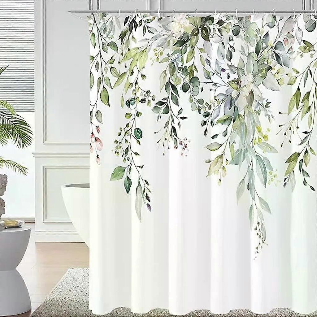 Eucalyptus Shower Curtain, Floral Bathroom Decoration, Waterproof, with Hooks, 180 x 180 cm, White