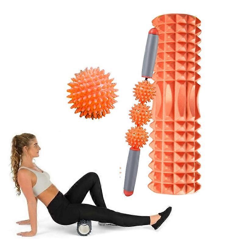 3 in 1 Eva Foam Roller Hollow Muscle Relaxation Roller Yoga Column Set, Length: 45cm (Orange Crescent) 1. Material: EVA outer column + PVC engineering inner tube, PVC massage stick 2. Size: The diameter of the massage ball is 7cm, the length of the massage stick is 41cm, and the length of the foam roller can be 45cm or 33cm. 3. Diamond bump design, even massage close to the body, relax without leaving dead corners 4. Gentle without stinging, durable 5. Fascia ball: solepalm massage, partial massage with massage roller, deep massage with foam roller