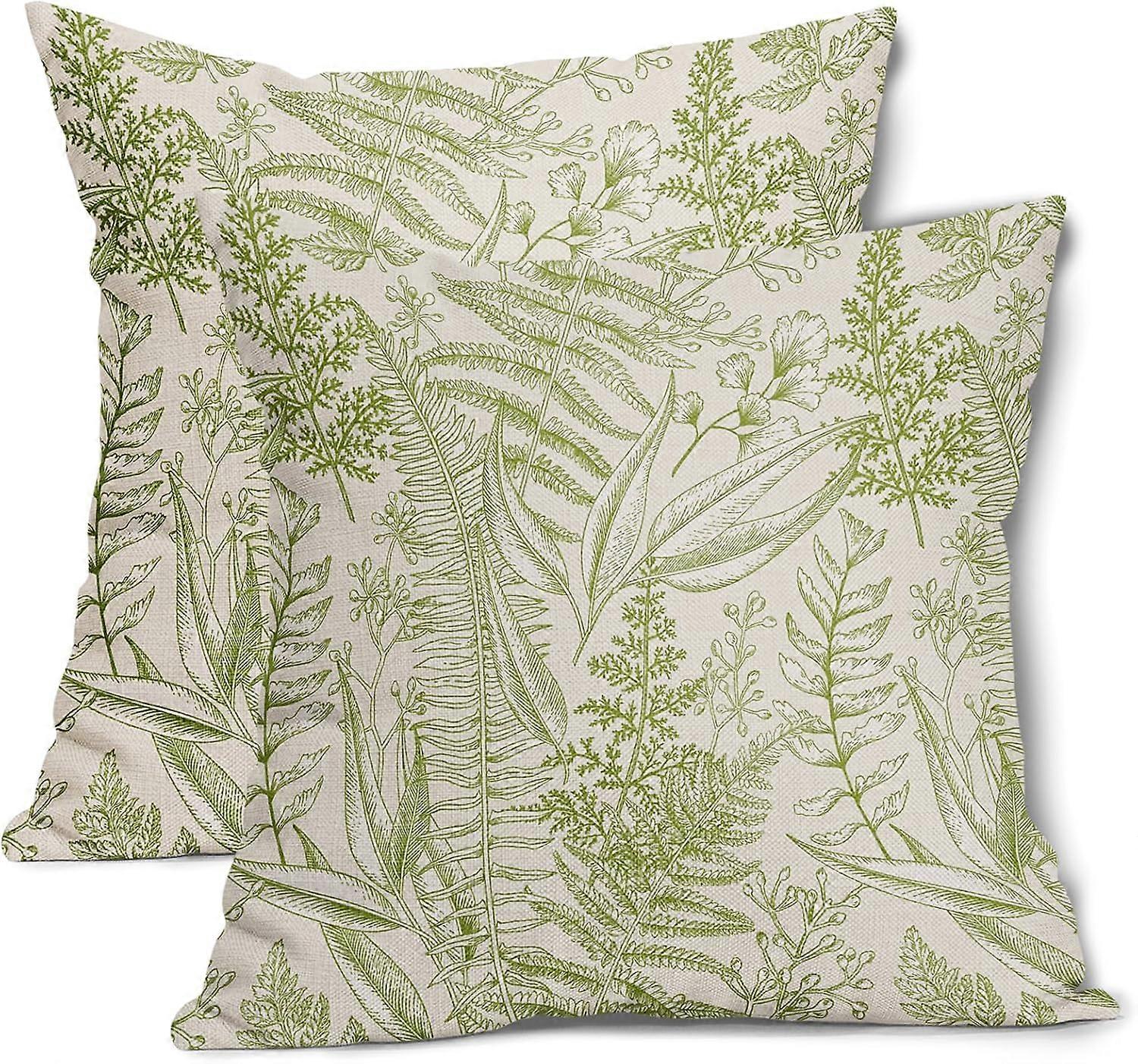 Lime Green Plant Pillow Covers 18X18 Inch Herbs Botanical Fern Vintage Leaves Floral Decorative Pillow Cases Set of 2 Cotton Linen Throw Pillows Farmh