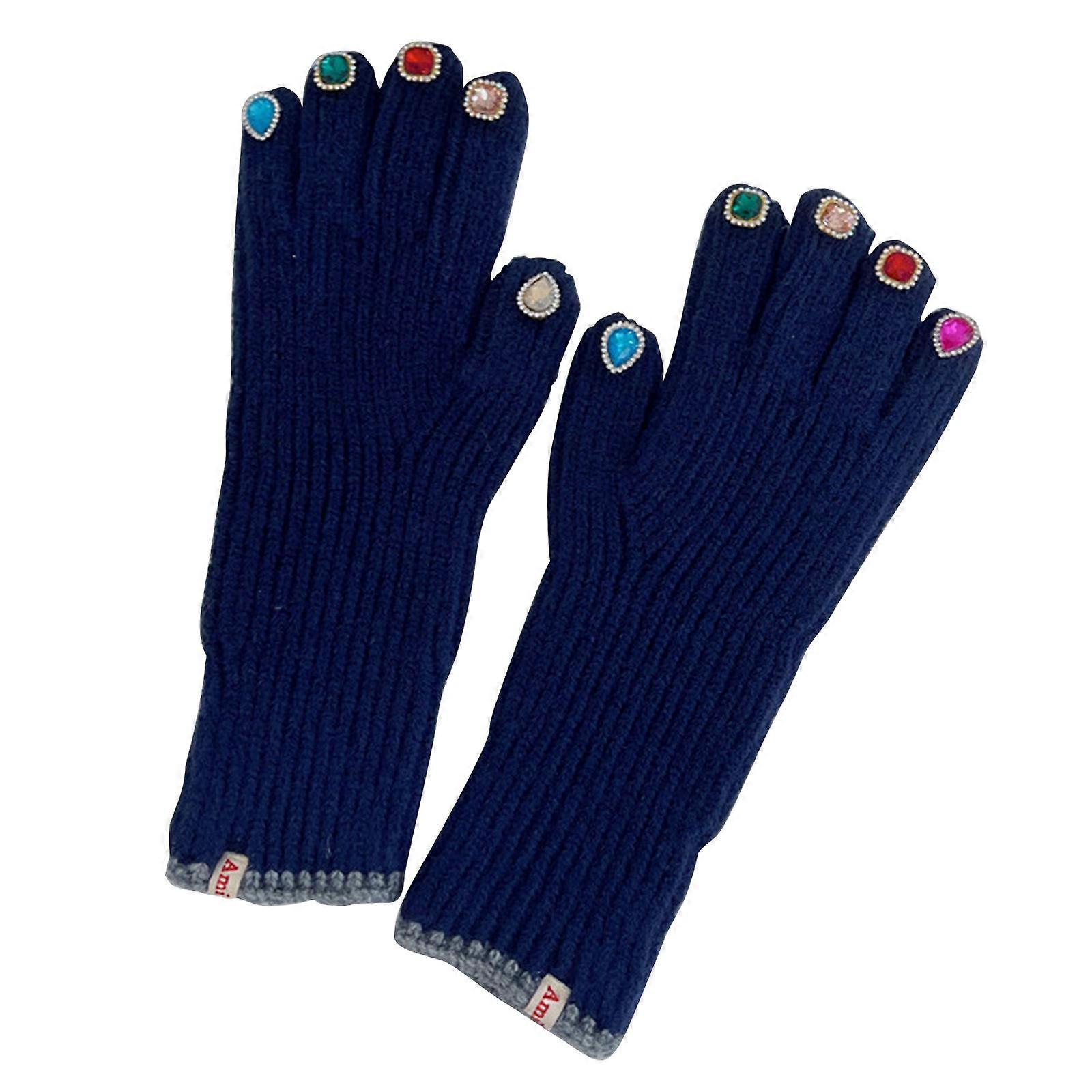 Rhinestone Gloves French Vintage Luxury Knit Gloves Women Full Finger Gloves with Rhinestone Decors on Finger Tips Navy Blue