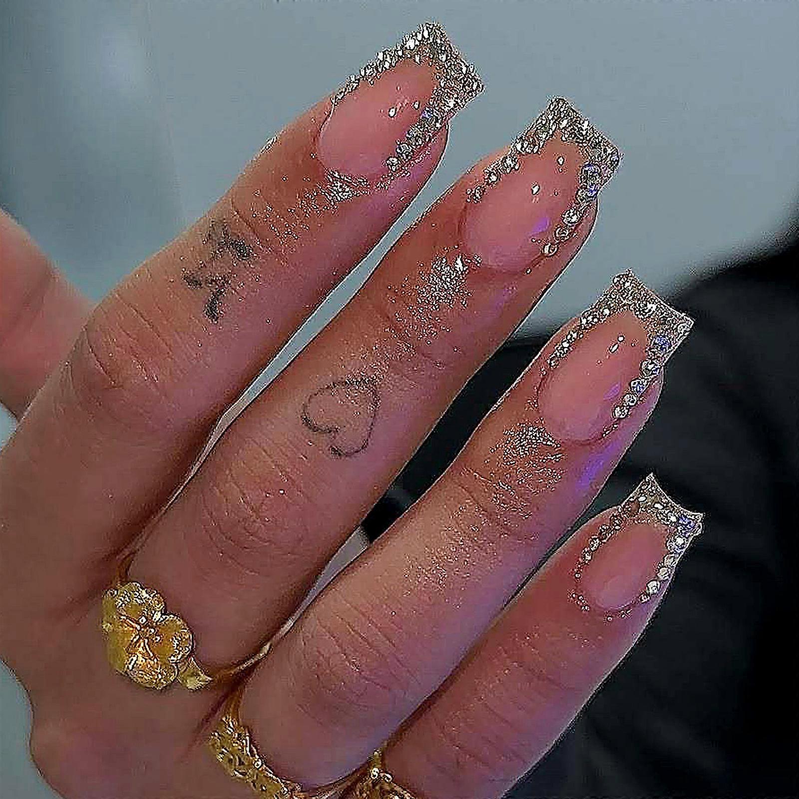 Press On Nail With Rhinestones Designs Nail Art Decoration Square Artificial Nail French Tips 24Pcs False Nail For Girls