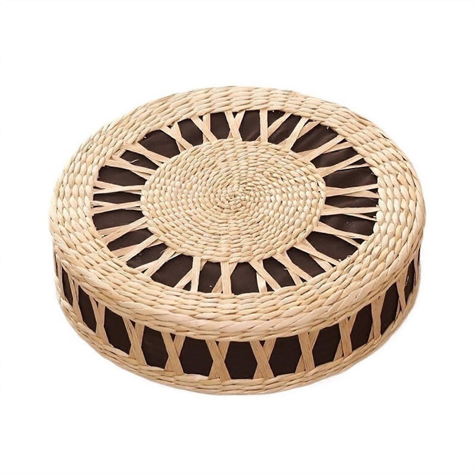 Round Meditation Floor Cushion 50cm Black Handmade Grass Woven Futon Seat Cushion For Living Room