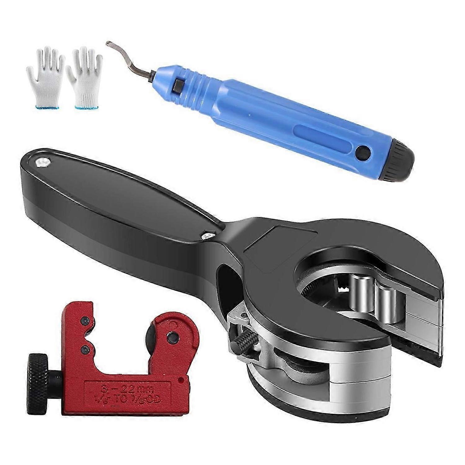 [Ratcheting Tubing Cutter]Our ratchet pipe cutter is designed for tight spaces and can easily cut copper pipes, PVC pipes, and soft metal pipes with a diameter of 1/4inch to 7/8inch (6-23mm). We also include a pair of gloves for extra protection and comfort during use. [Multiple Scene Usage]Our ratcheting tubing cutter have a compact, ergonomic design, making them ideal for cutting pipes close to walls or pipes. We've designed a longer handle to that you only need less force to complete the cutting work during use, thereby reducing hand fatigue. [2 and 1 Design]This 2 in 1 close quarters tube compact Cutter can be used alone or with a ratchet handle, This design increases its flexibility and practicality, allowing you to use it in narrower areas, making your work more convenient. [Convenient and Practical]The adjustable knob of this2 in 1 Close Quarters Tube Compact Cutter can easily set the blade position to suit the required pipe size, thereby improving cutting accuracy and speed. At the same time, its and small size do not take up much space and are very convenient to carry. [Longer Lifespan]Our tubing cutter are made to last longer, with steel blades that cut pipes in seconds, and replaceable blades that are stored in the handle, ensuring you can use it for a long time.<br><br>colour: As Shown material: Metal+Plastic<br><br>Package Contents: 1 x ratchet cutter 1 x trimming cutter 1 x micro-cutter 1 pair x gloves<br><br>Only the above package content, other products are not included. Note: Light reflection and different displays may cause the color of the item in the picture a little different from the real thing. The measurement allowed error is +/- 1-3cm.