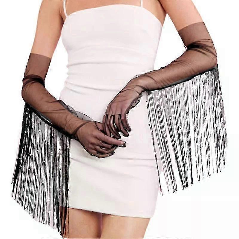 Latin Dance Gloves, Breathable Stretchy Long Mesh with Stylish Tassels