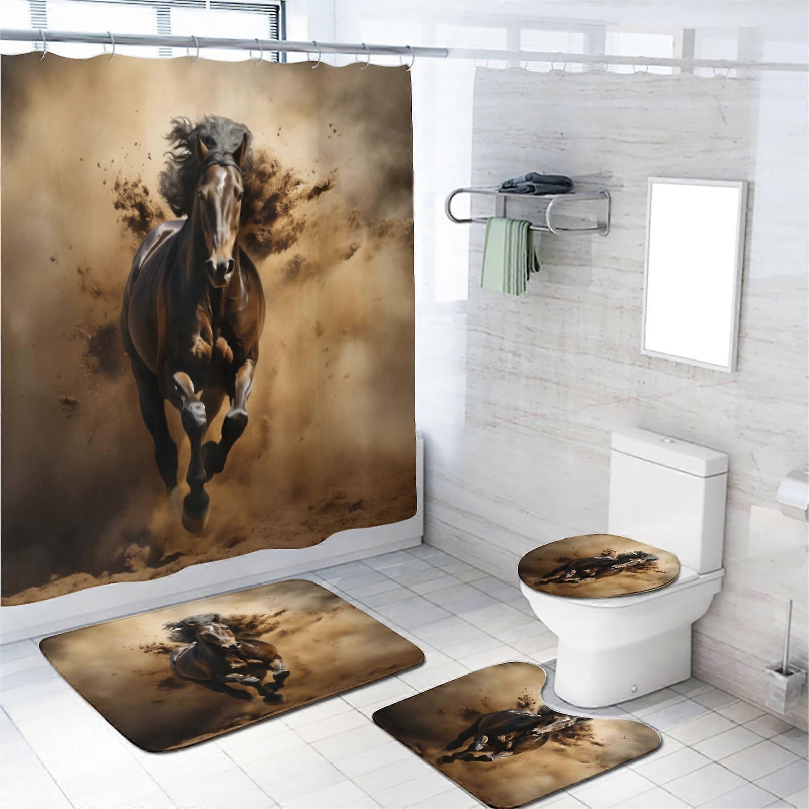 Running Horse 4PC Shower Curtain Set with Non-Slip Rug, Farm Wild Animal Vintage Country Waterproof Bath Curtains & Mats 72x72 Inch
