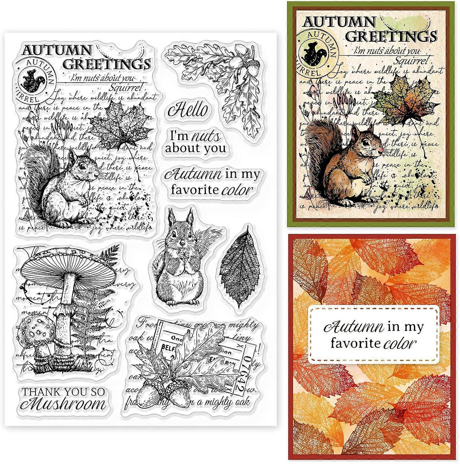 Squirrel Animal Clear Stamp Mushroom Background Maple Leaf Silicone Clear Stamp Autumn Seals for DIY Scrapbooking Journals Decorative Cards Making Pho