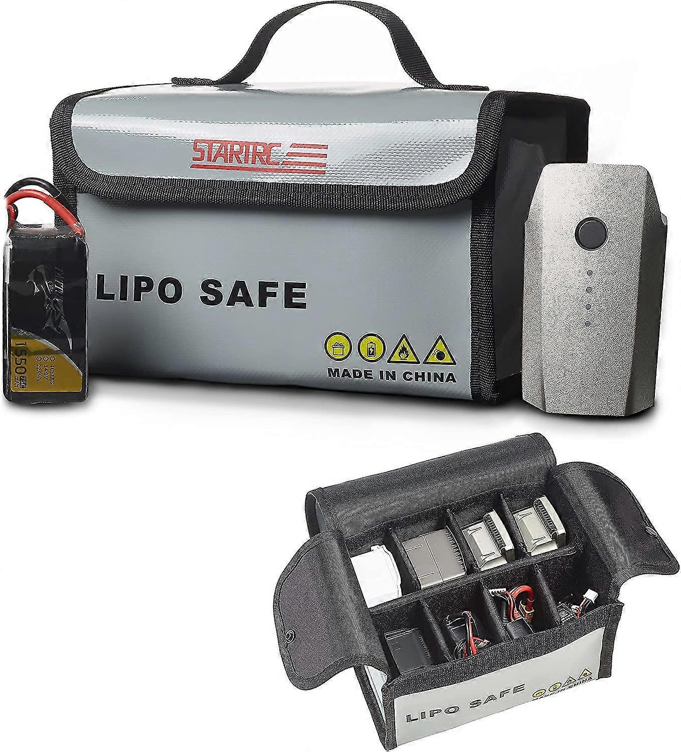 PROTECTIONRC Lipo Lithium Polymer Battery Safety Battery Charge & Storage Bag,the safest way to charge and store your lipos battery.Protect your workshop and home from the hazard of lipo charging.FIREPROOF AND MOISTURE PROOFThe outer surface of this fireproof bag is made of flame-retardant PVC fabric and the supreme flame retardant glass fiber,is designed to stop and contain any fire caused by incorrectly charged lipo battery packs with poor functionality.CONVENIENTThe battery explosion-proof bag is packed with multiple adhesive isolation short plates. You can adjust the internal space structure of the battery explosion-proof bag arbitrarily to prevent the batteries from rubbing against each other during transportation and causing fire.LARGE SPACEThis explosionproof lipo safe bag demension is 8.46*6.5*5.71inch, which can contains about 25pcs 3 Cells 2200mAh lipos You can put normal lipos, liFe, liHv or other batteries of DJI,such as MINI 2/Mavic mini/Mavic air 2/Mavic Air 2S/FPV Drone and so on.NOTETo ensure safety, please be extreme caution when charging and never leave the lithium battery unattended.(Batteries are not included)
