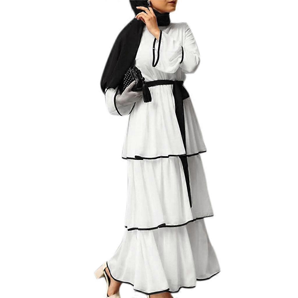 Layered Skirt Solid Color Muslim Dresses O-Neck Dubai Turkey Islam Malay Clothing Long Robe for Women Girls White