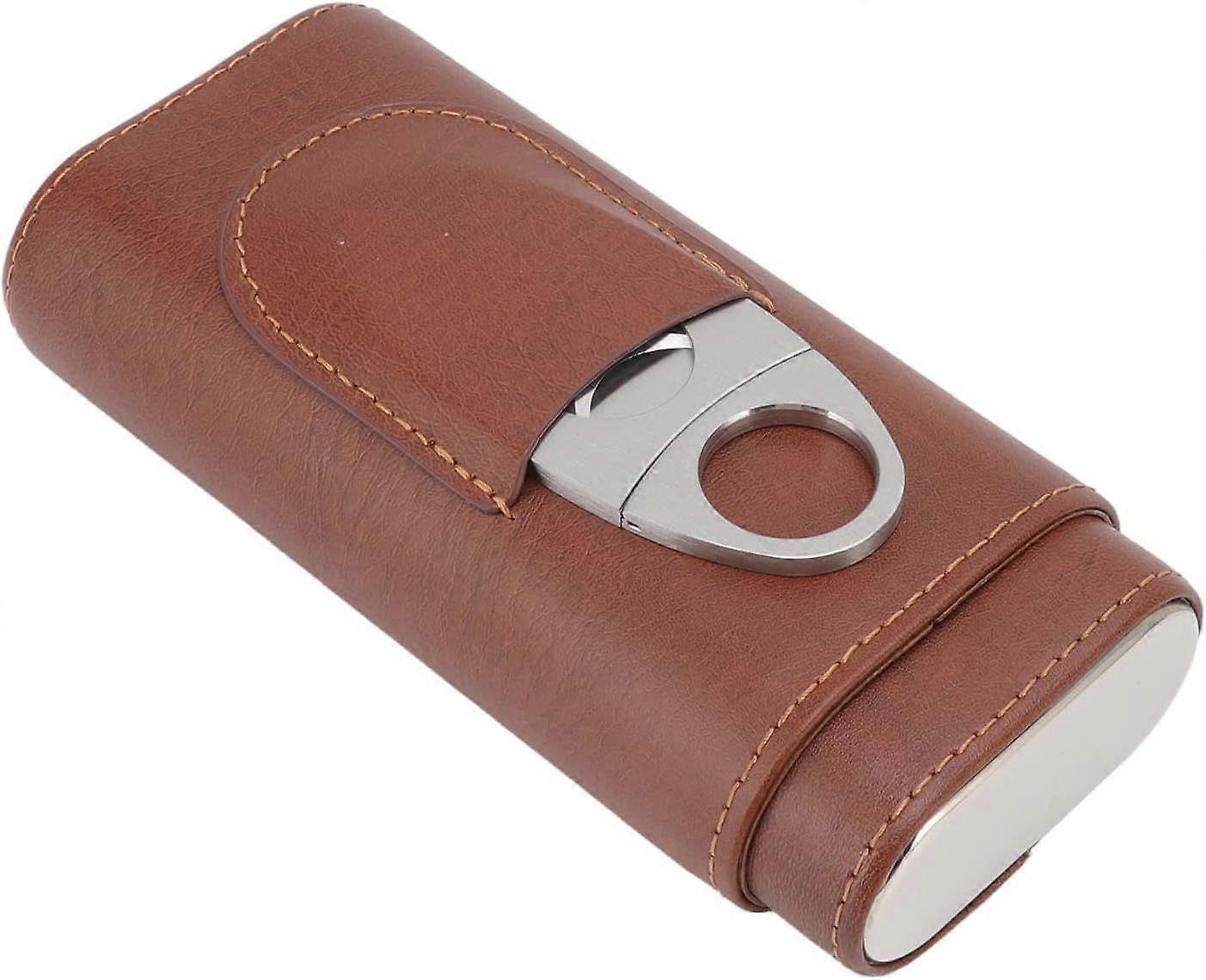Leather 3 Finger Cigar Case Cedar Wood Lining Travel Portable Cigar Holder with Scissors Brown Hand Sewing Technique Imported Leather - Generic