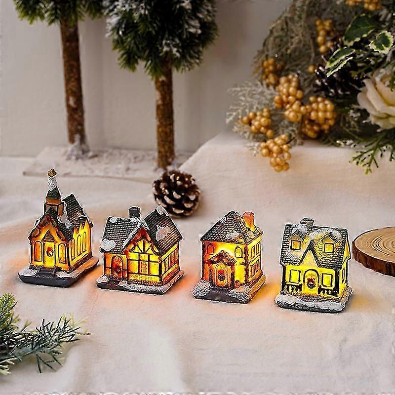Resin Christmas Small House Village Light Up Building Luminous Figurines Xmas Ornament Gift for Kids