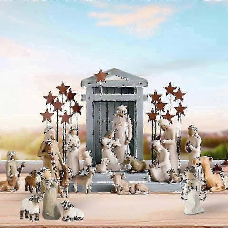 Resin Nativity Starter Figures with Three Wisemen+Metal Stars 22 Pcs Set