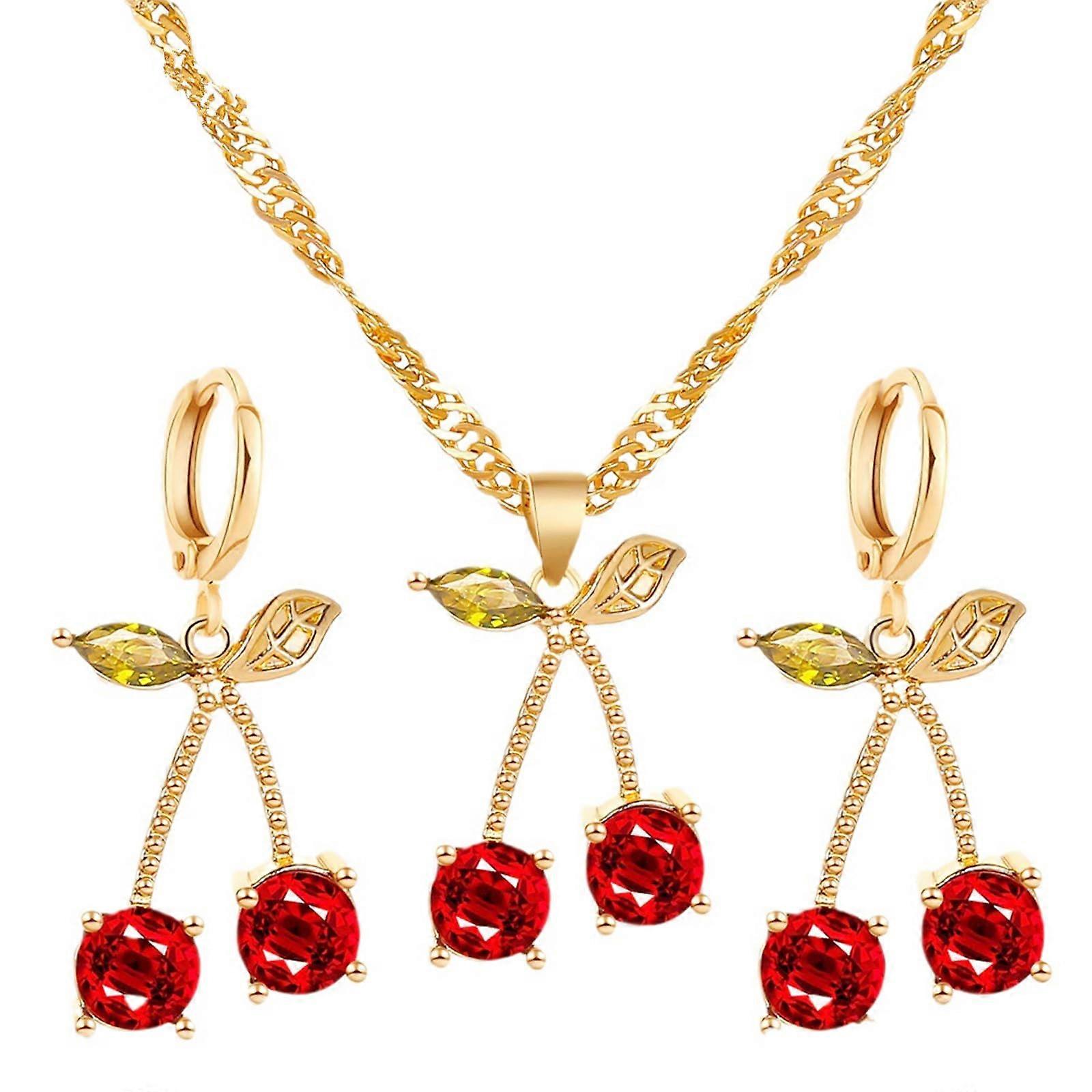 Red Cherry Jewelry Set - Gold-Plated Crystal Necklace and Earrings for Women, Elegant Fashion Accessories in Red