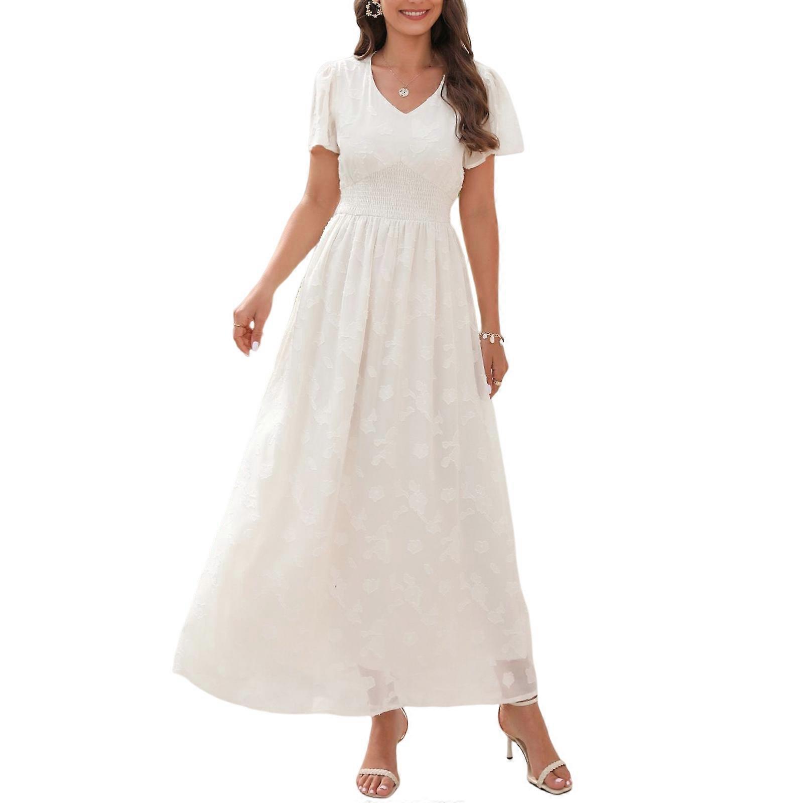 Womens Vintage Floral Jacquard V-Neck Ruffle Short Sleeve Flowy Long Dress Smocked Waist Pleated A-Line Swing Dresses White XL