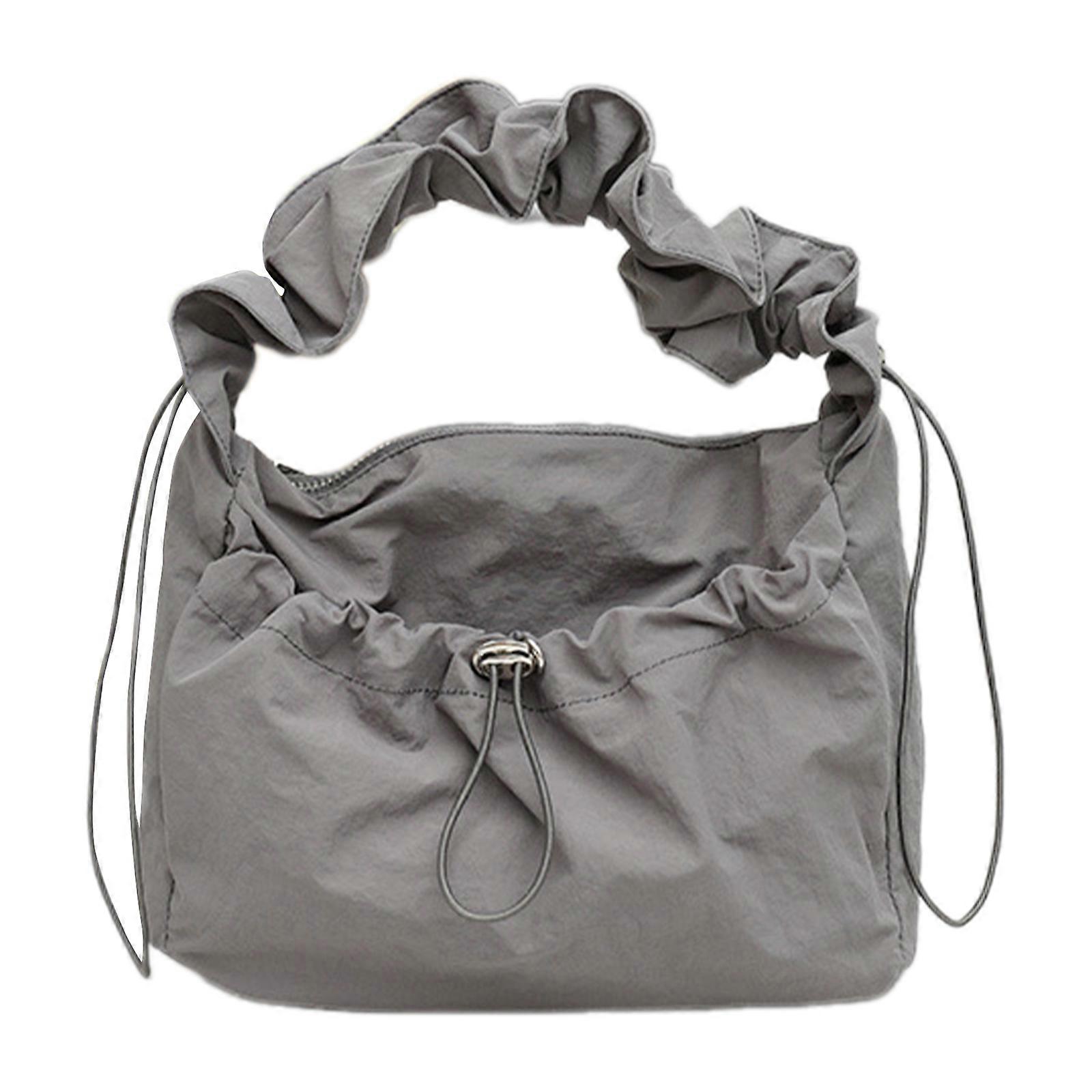 Womens Aesthetic Casual Nylon Underarm Bag Pleated Ruched Drawstrings Shoulder Bag Solid Color Handbag Crossbody Bag Gray