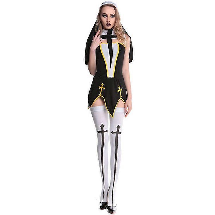 Embrace dramatic style with this gothic nun costume. Its sharp lines, cross accents, and bold black-and-white palette create an unforgettable silhouette for themed events. Material: Uniform TwillStyle: Sleeveless bodycon mini dress with gold-trimmed necklineAccessories Included: Dress, Headpiece, Arm Sleeves, Stockings Design Highlights: Cross embroidery, bold neckline, fitted silhouette, soft stretch feel Available Colours: Black, WhiteAvailable Sizes: S, M, L, XL, XXL Size Guide:S Bust: 6890cm, Waist: 6674cm, Shoulder: 34cm, Sleeve: 33cm, Skirt Length: 6474cm, Hat Circumference: 48cmM Bust: 7294cm, Waist: 7078cm, Shoulder: 35cm, Sleeve: 34cm, Skirt Length: 6575cm, Hat Circumference: 48cmL Bust: 7698cm, Waist: 7482cm, Shoulder: 36cm, Sleeve: 35cm, Skirt Length: 6777cm, Hat Circumference: 48cmXL Bust: 80102cm, Waist: 7886cm, Shoulder: 37cm, Sleeve: 36cm, Skirt Length: 6979cm, Hat Circumference: 48cmXXL Bust: 84106cm, Waist: 8290cm, Shoulder: 38cm, Sleeve: 37cm, Skirt Length: 7080cm, Hat Circumference: 49cm Best For: Gothic cosplay, Halloween parties, character photoshoots, or stage performance.