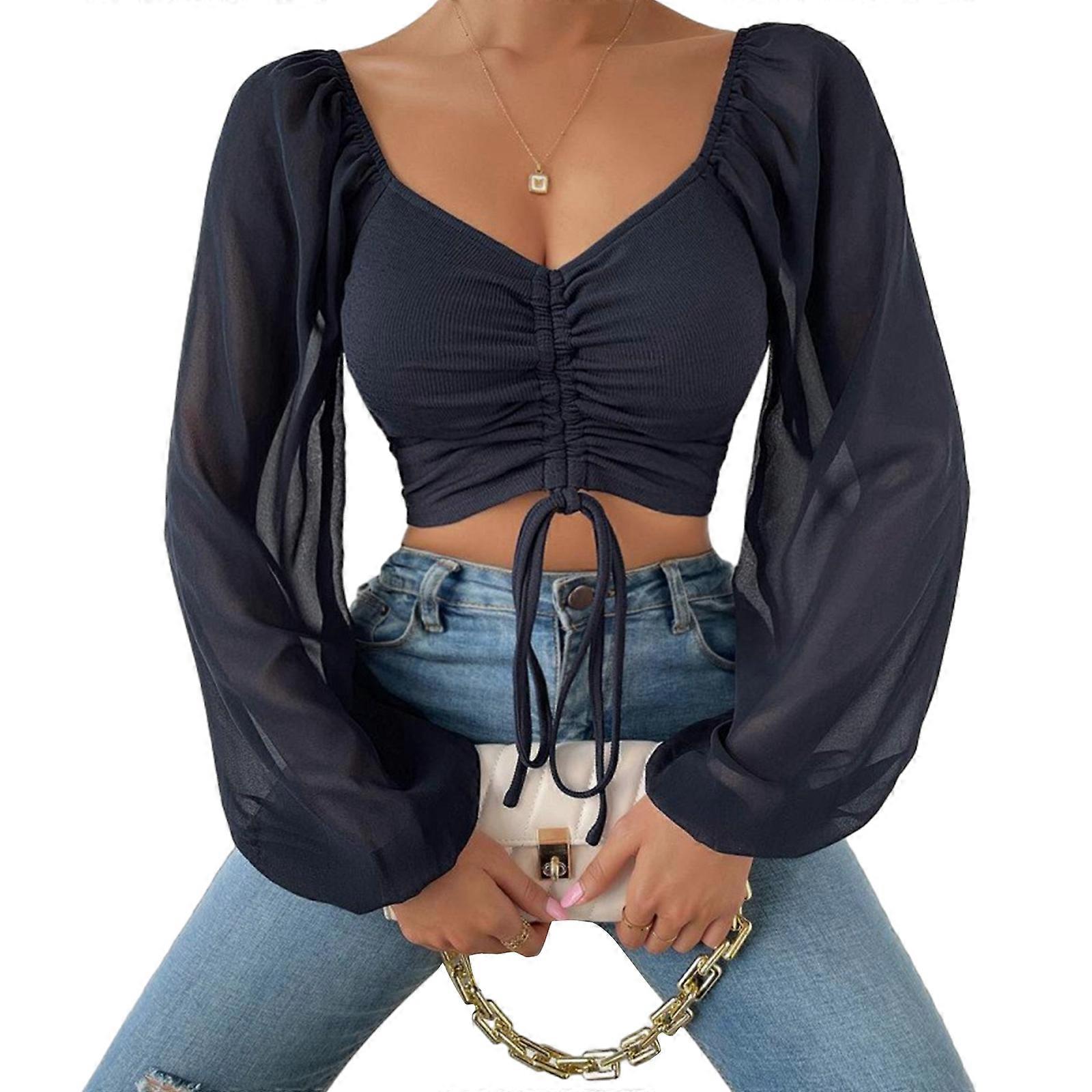 Womens Sheer Chiffon Puff Long Sleeve Ribbed Blouses Shirts Sweetheart Neck Drawstring Ruched Front Bodycon Crop Tops Navy Blue XL